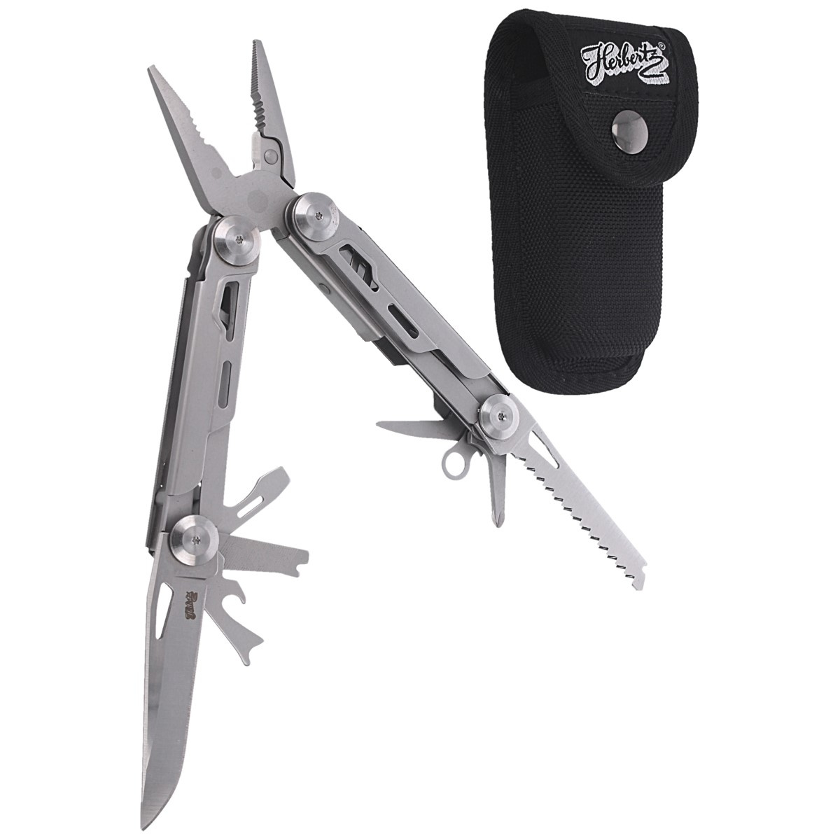 - Multitool niemieckiej marki Herbertz Solingen z satynowanej stali nierdzewnej. Posiada: kombinerki, przecinak drutu, ostrze, piłę, otwieracz do butelek, śrubokręt płaski i krzyżakowy, pilnik, otwieracz do puszek, ściągacz izolacji, szydło, kółko do kluczy