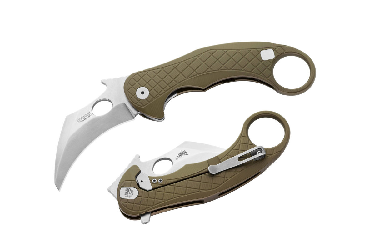 - L.E.One Green Aluminium, Stone Washed MagnaCut, najbardziej zaawansowany technicznie składany karambit na świecie! Opatentowane technologie Lionsteela i niepowtarzalny projekt Emerson Design!