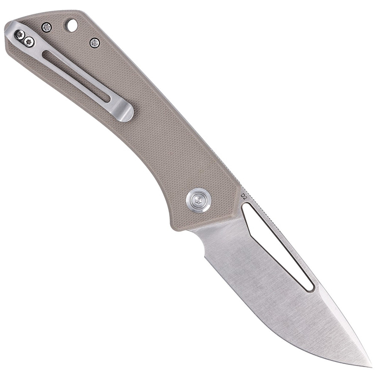 - Thalia Tan G10, Satin kompaktowy, mocny folder EDC. Głownia drop point ze stali narzędziowej D2, Front Flipper do otwierania oraz rękojeść z kompozytu G10 zapewniająca pewny uchwyt. Znakomity stosunek jakości do ceny! Bestseller!