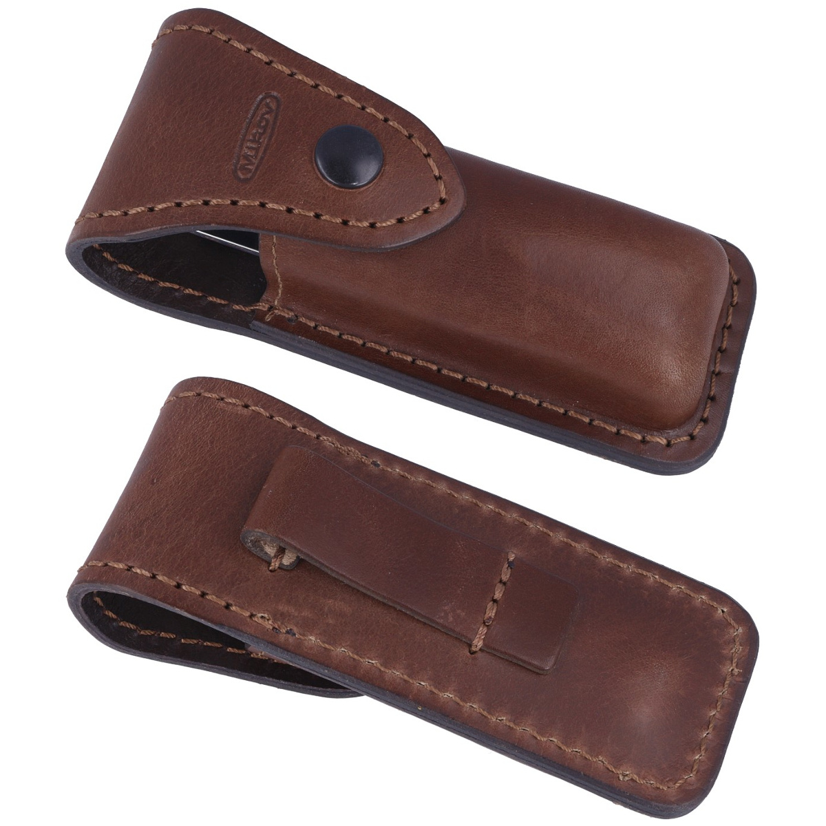 Etui - zapinane na zatrzask typu Prym. Wykonane z wysokiej jakości naturalnej skóry w kolorze brązowym z tłoczonym logo producenta. Skórzana pochwa posiada mocowanie do pasa lub oporządzenia umożliwiające przenoszenie noża w pozycji pionowej.
