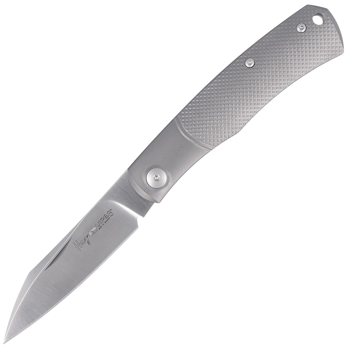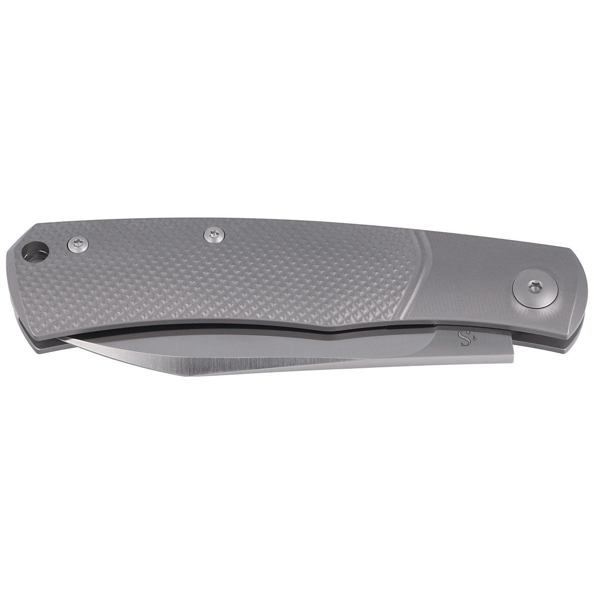 - Hug Gray Titanium, Satin lekki folder wyposażony w mechanizm SlipJoint. Projekt francuskiego producenta noży customowych Sachy Thiel'a. Smukłe rękojeści z geometryczną teksturą i zmodyfikowane ostrze Wharncliffe nadające agresywny wygląd i funkcjonalność