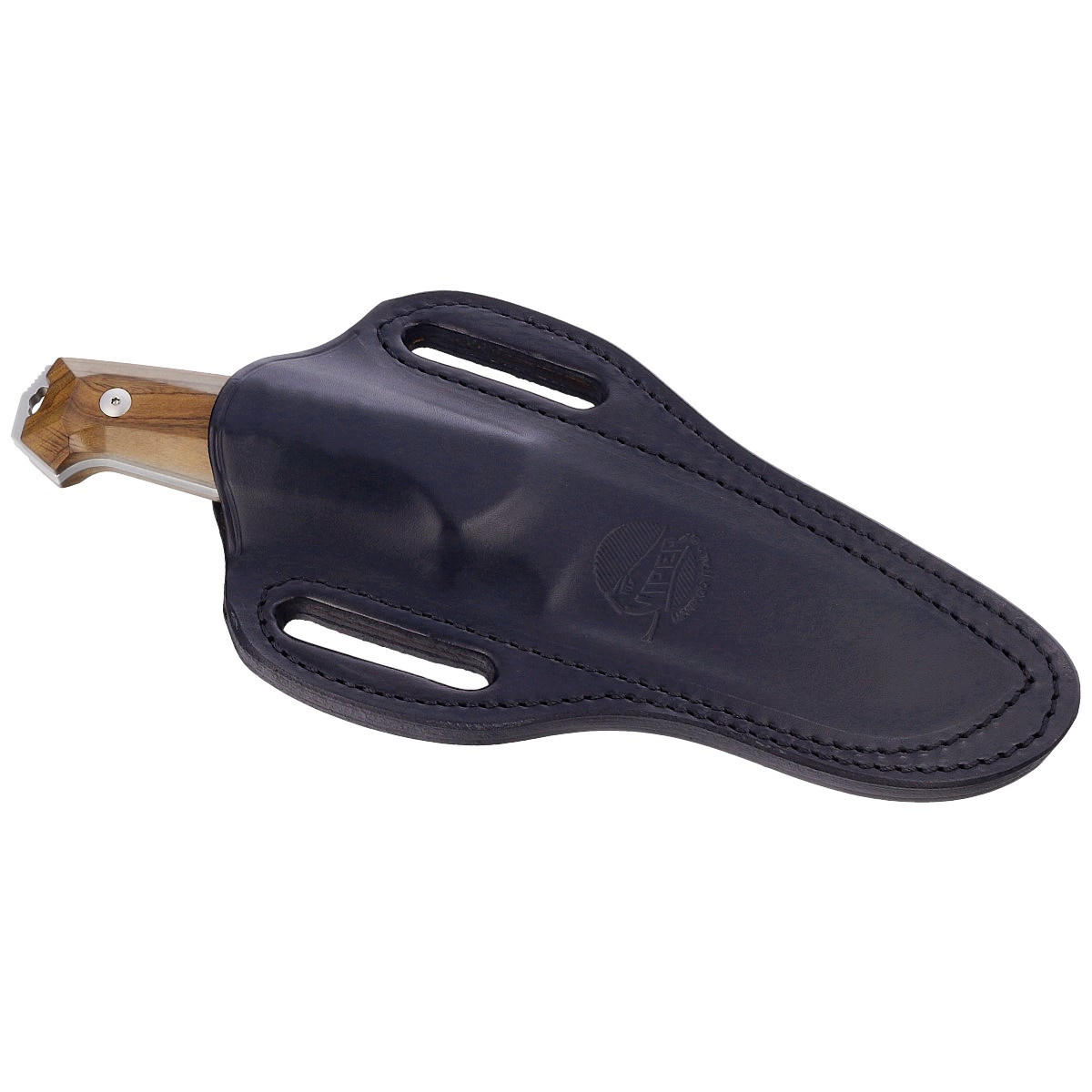 Pochwa - przedłużana, chroniąca głownię wraz z częścią rękojeści. Ręcznie szyta, wykonana z naturalnej skóry w czarnym kolorze z tłoczonym logo producenta. Brzeg etui przeszyto ozdobną nicią. Mocowana na pas umożliwia przenoszenie noża w pozycji pionowej.