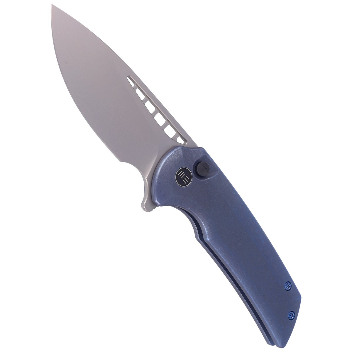 - Mini Malice Blue Titanium, Silver Bead Blasted folder z szerokim ostrzem przystosowanym do intensywnego użytkowania. Owoc współpracy WeKnife z Ferrum Forge Knife Works. Podobnie jak wszystkie ich projekty ma doskonałą ergonomię, siłę cięcia i piękne linie