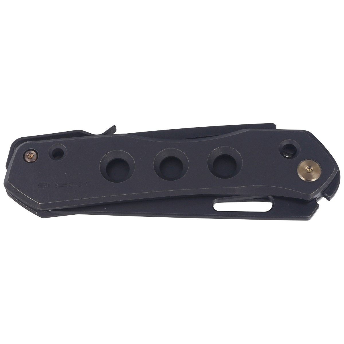 Głownia - typu Reverse Tanto wykończona maskującą rysy metodą Black Stonewashed. Otwierana za pomocą podłużnego otworu w klindze (Thumb Hole), dzięki czemu mogą z niego bez problemu korzystać osoby prawo i leworęczne. Za gładką pracę mechanizmu otwierającego odpowiadają ceramiczne łożyska kulkowe. Niewielka grubość klingi w połączeniu z wysokim, płaskim szlifem (Flat Grind) daje doskonałą geometrię krawędzi tnącej oraz ekstremalną wydajność cięcia. Całość blokowana jest autorską blokadą Snecx'a, Superlock.