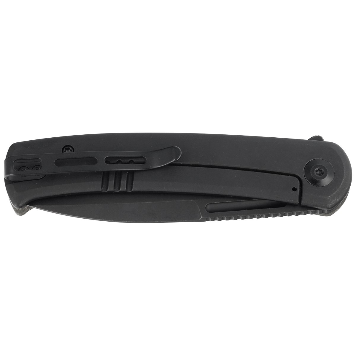 Głownia - typu Spear Point wykończona antyrefleksyjną metodą Black Stonewashed. Wydatny brzusiec wydłuża długość krawędzi tnącej w stosunku do długości klingi zbiegając się w kierunku ostrego jak igła czubka noża. Niewielka grubość ostrza w połączeniu z wysokim płaskim szlifem (Flat Grind) daje doskonałe właściwości tnące połączone z wysoką wytrzymałością. Ceramiczne łożyska kulkowe wspomagają płynne otwarcie ostrza, które można otworzyć za pomocą płetwy flippera (index-finger flipper) pełniącej po otwarciu funkcję jelca. Dzięki temu mogą z niego bez problemu korzystać osoby prawo i leworęczneAby zachować pełną kontrolę nad ostrzem, na grzbiecie klingi upper jimping, karbowane oparcie pod kciuk. Całość blokowana jest solidną blokadą Frame Lock.