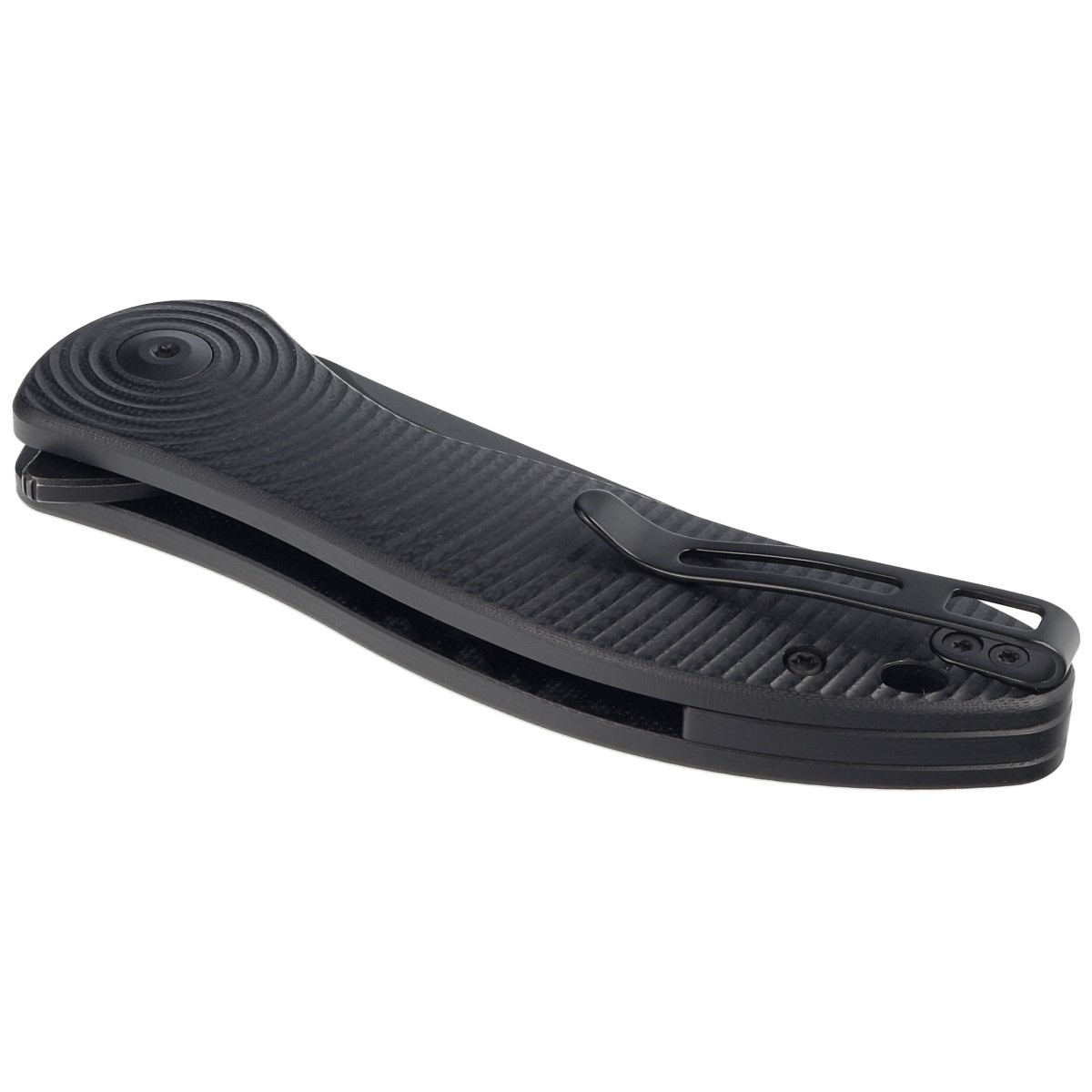 Rękojeść - okładziny z czarnego G10, włókna szklanego prasowanego pod ciśnieniem z żywicą, z pięknym wzorem koncentrycznie rozchodzących się okręgów. Fazowane krawędzie okładek eliminują ostre krawędzie dla wygody i poprawiają pewność uchwytu. Backspacer wykonano z tego samego materiału co okładziny rękojeści. Oś pivota zdobi stylizowane logo marki Civivi. Jednopozycyjny, prawostronny klips deep carry pozwala przenosić dyskretnie nóż w kieszeni w pozycji tip-up (czubkiem ostrza do góry).