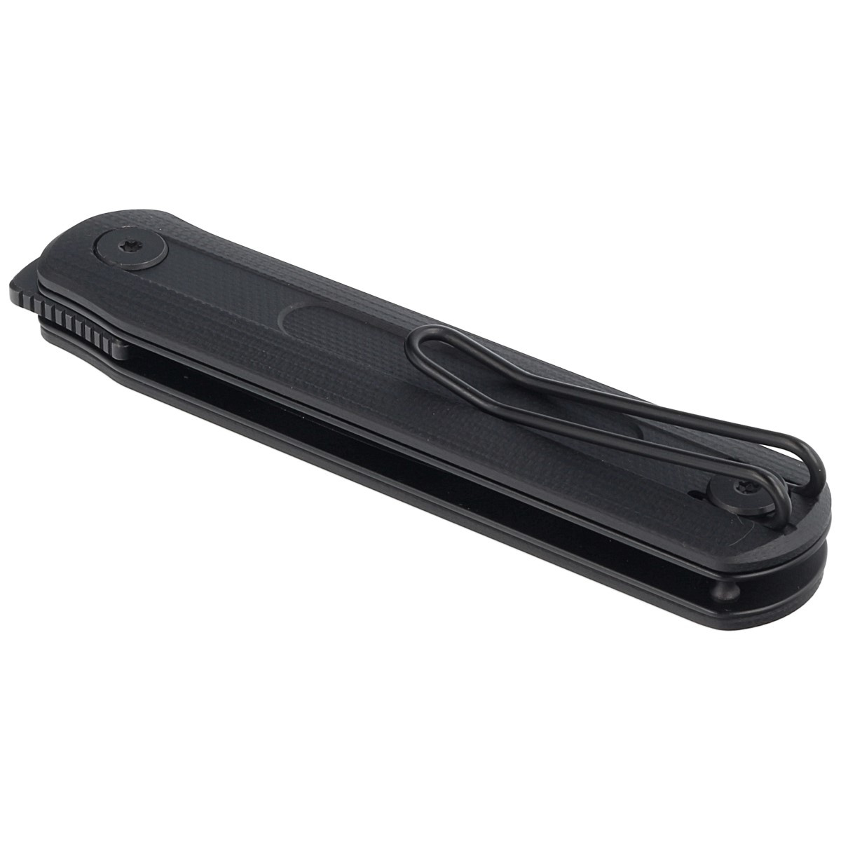 Rękojeść - okładziny z czarnego G10 (włókno szklane prasowane pod ciśnieniem z żywicą syntetyczną), które zostały przykręcone do stalowych linersów. Konturowanie okładek eliminują ostre krawędzie dla wygody i pewności uchwytu. Otwarta konstrukcja tzw. open-backed bez typowego backspacera, mocowana do siebie stalowymi tulejami dystansowymi ułatwia czyszczenie. Prosta, pewna konstrukcja daje pewność wieloletniego użytkowania. Klips typu deep carry, dwupozycyjny (prawo/lewo), umożliwia przenoszenie noża w pozycji tip-up (czubkiem do góry).