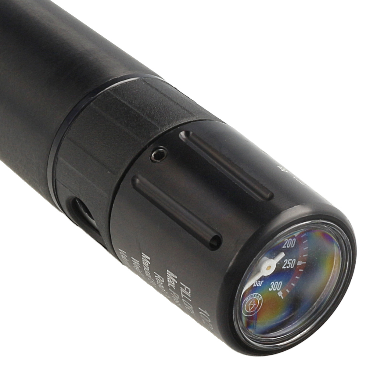 • Aluminiowy kartusz o poj. 255cc firmy Hatsan do wiatrówek PCP Gladius Bullpup z tzw. układem bezkolbowym. Manometr pozwala kontrolować ciśnienie w zbiorniku a tym samym stopnień jego naładowania. Obrotowa osłona chroni wlot do kartusza przed uszkodzeniem.