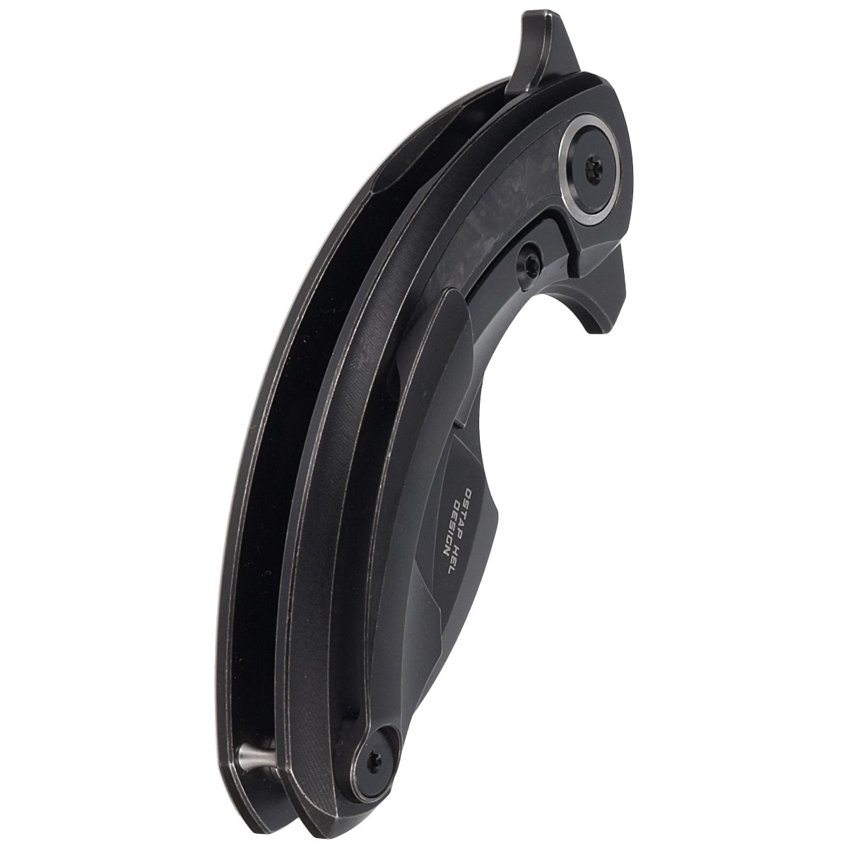 Rękojeść - to dwa kawałki litego tytanu 6AL4V z efektownymi wstawkami z Marbled Carbon Fiber. Fazowane krawędzie okładek eliminują ostre krawędzie dla wygody, a podcięcie na palec (fore finger groove) poprawia pewność uchwytu. Otwarta konstrukcja tzw. open-backed mocowana tulejami dystansowymi redukuję wagę oraz ułatwia czyszczenie. Jednopozycyjny, prawostronny tytanowy klips umożliwia przenoszenie noża w pozycji tip-up, czubkiem ostrza ku górze.