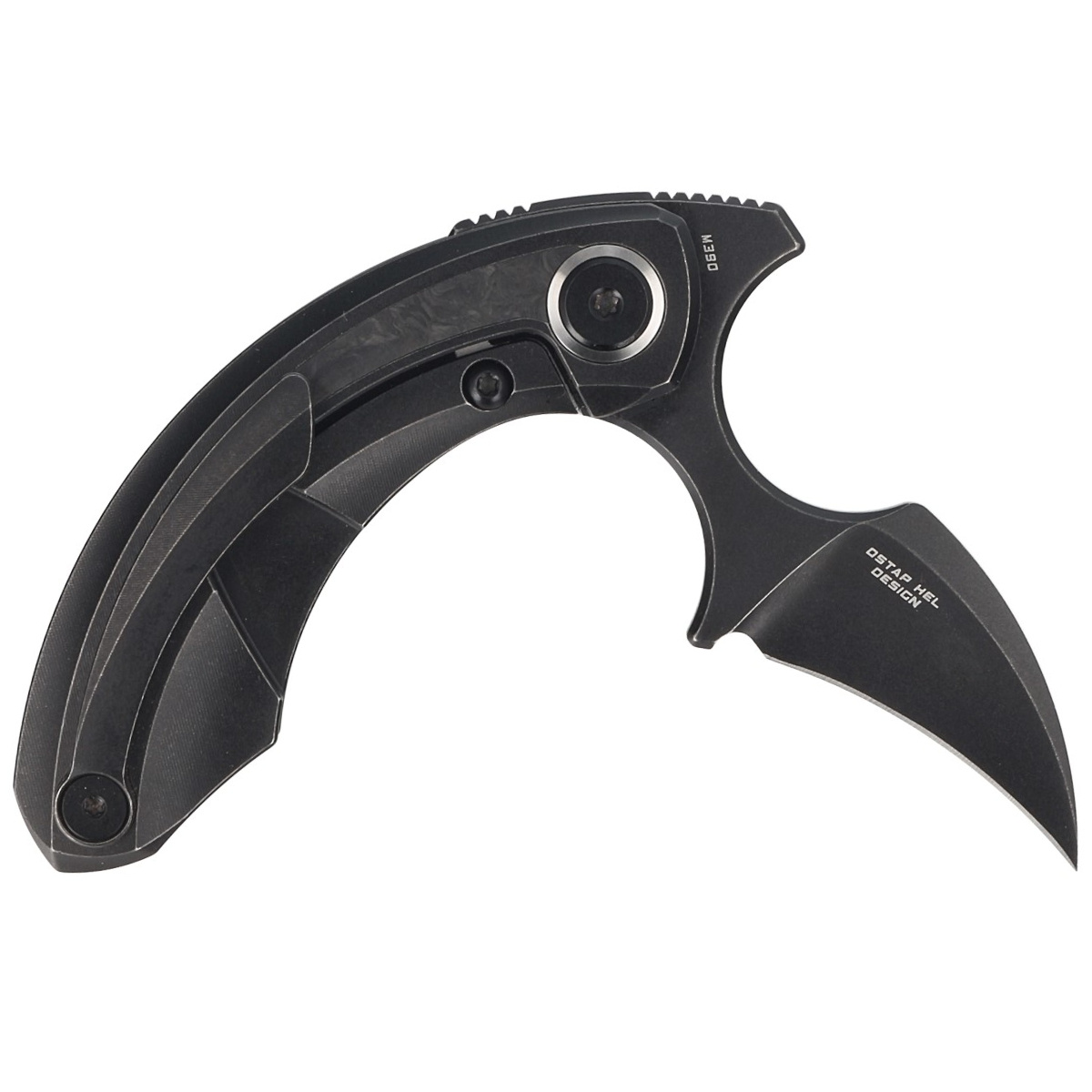 Głownia - typu Hawkbill z maskującym drobne rysy wykończeniem Black Stonewashed. Wklęsła krawędź tnąca zbiega się w kierunku ostrego jak igła czubka noża. Grubość klingi zapewnia wysoką wytrzymałość podczas gdy wysoki, płaski szlif daje doskonałą geometrię krawędzi tnącej oraz ekstremalną wydajność cięcia. Ceramiczne łożyska kulkowe wspomagają otwarcie ostrza za pomocą szybkiej płetwy flippera (index-finger flipper). Całość blokowana jest sprawdzoną i popularną blokadą frame lock ze stalową wkładką zabezpieczającą przed wycieraniem czoła blokady. Po otwarciu, przewężenie tuż za głownią pozwala wygodnie uchwycić nóż zaciśniętą ręką, w pozycji push-dagger. Ostrze wystaje wtedy spomiędzy palców niczym drapieżny szpon!