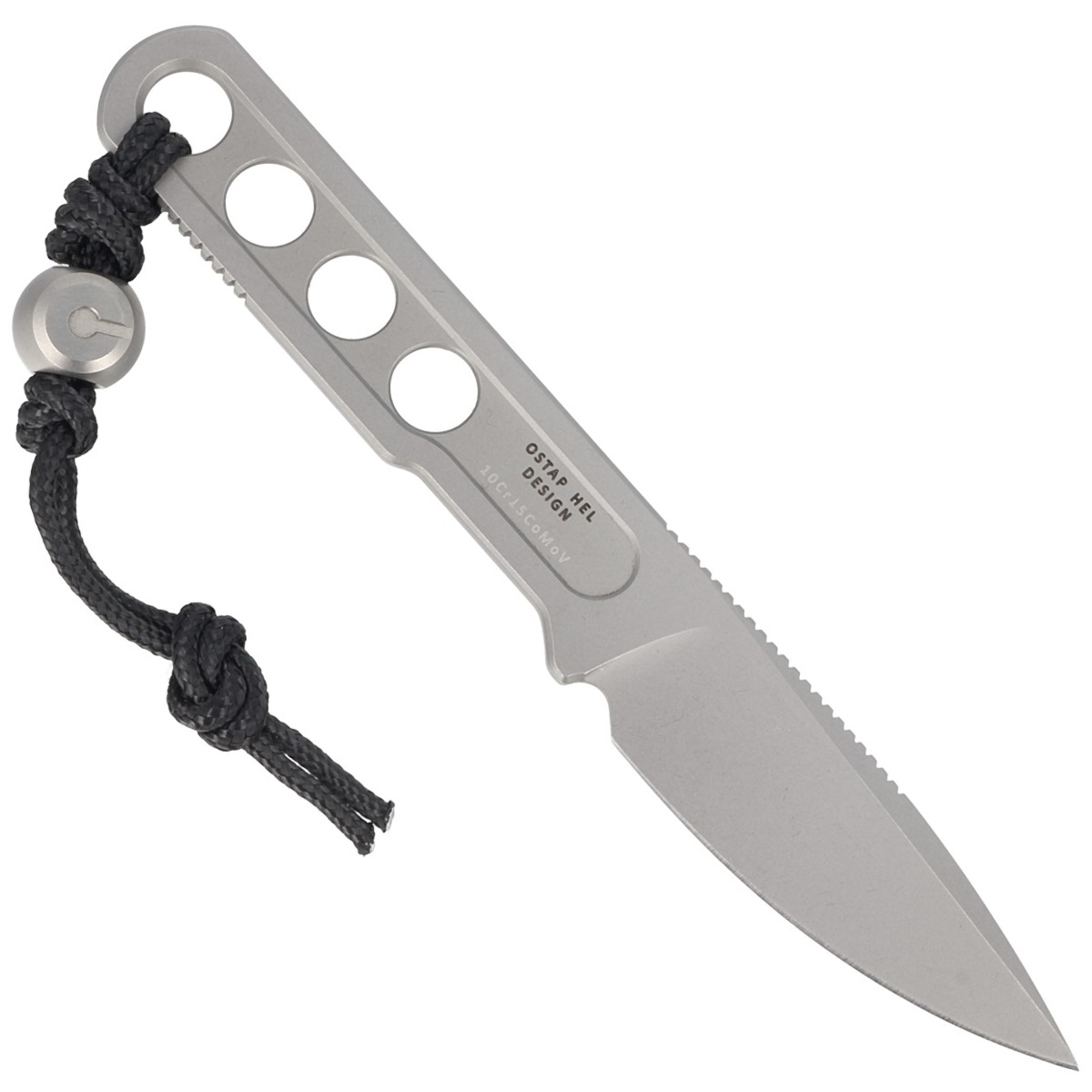 Rękojeść - tang noża z otworami umożliwiającymi zaplecenie np. paracordu dookoła. W dolnej części znajdziemy karbowany (jimping) fragment polepszający chwyt. Prosta, solidna konstrukcja daje gwarancję wieloletniego użytkowania. W komplecie dostajemy efektowną zawieszkę z tytanowym koralikiem ozdobionym logo firmy.