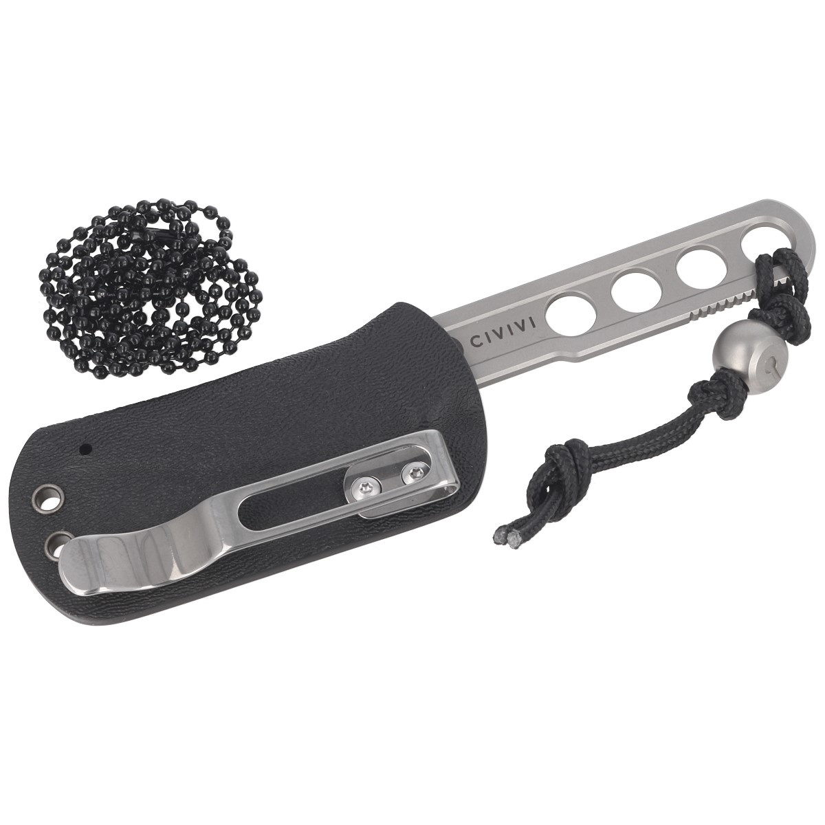 Pochwa - wykonana z kydexu którą dzięki montowanemu do niej klipsowi możemy zaczepić o pasek lub brzeg kieszeni. Możemy również nosić nóż na szyi przy pomocy dołączonego do zestawu łańcuszka.