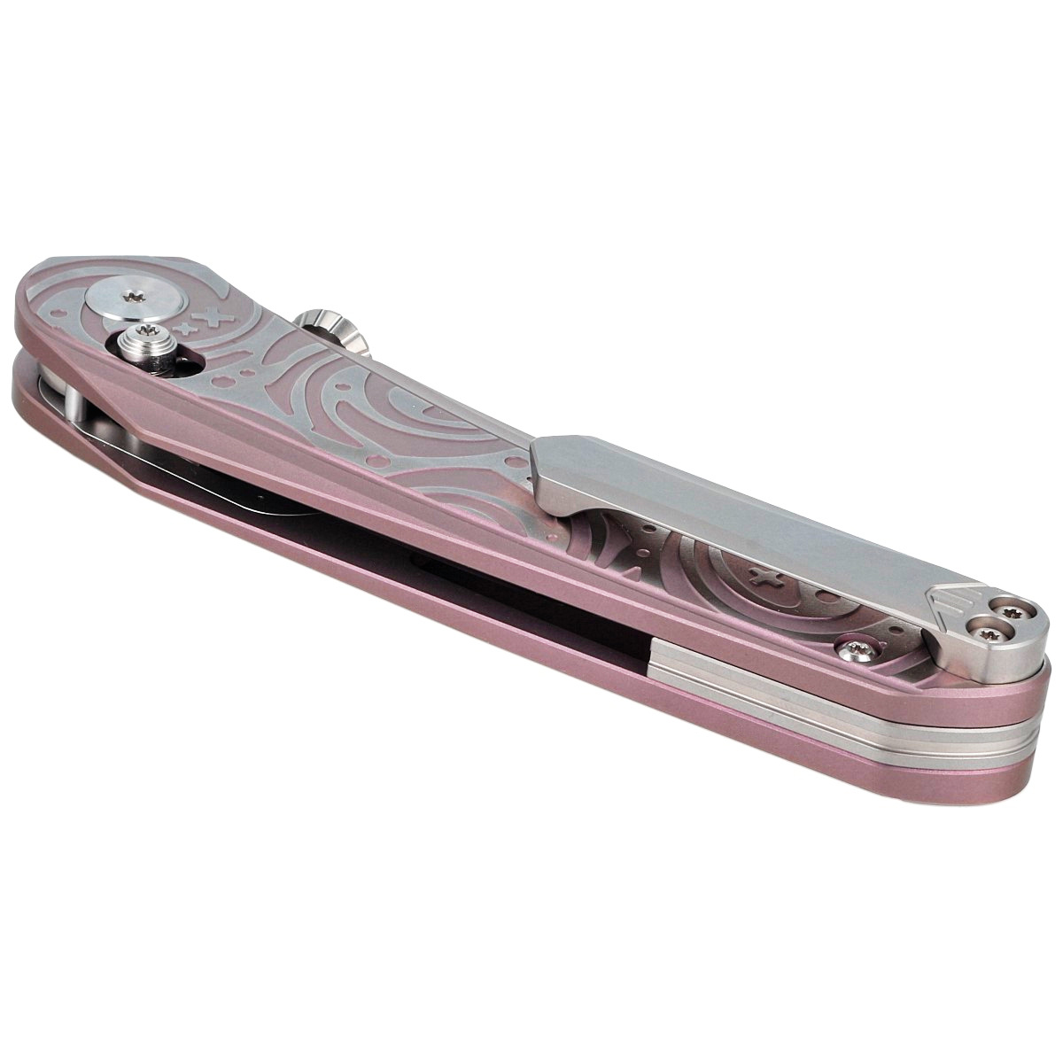 Rękojeść - to dwa kawałki litego tytanu 6AL4V. Fazowane krawędzie okładek eliminują ostre ranty dla wygody i poprawiają pewność uchwytu, dodatkowe zdobienie w postaci wyfrezowanych motywów graficznych. Masywny backspacer do którego przymocowano okładziny gwarantuje sztywność i wytrzymałość całej konstrukcji. Dwupozycyjny, lewo/prawostronny tytanowy klips z motywem graficznym ćmy umożliwia przenoszenie noża w pozycji tip-up, czubkiem ostrza ku górze.