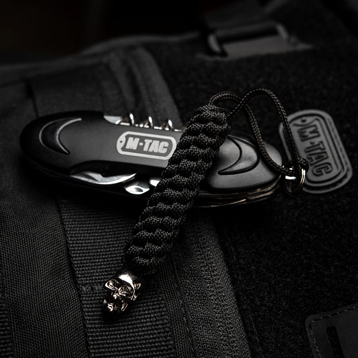 - M-Tac Helix Skull Black, przywieszka do noża, latarki, breloka, wykonana z paracordu, zakończona metalową czaszką. Oprócz walorów estetycznych, przedłuża rękojeść noża ułatwiając wyciągnięcie go z kieszeni.