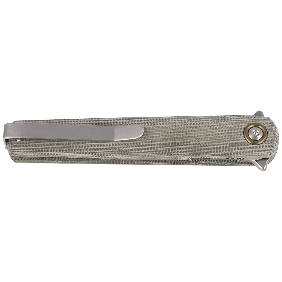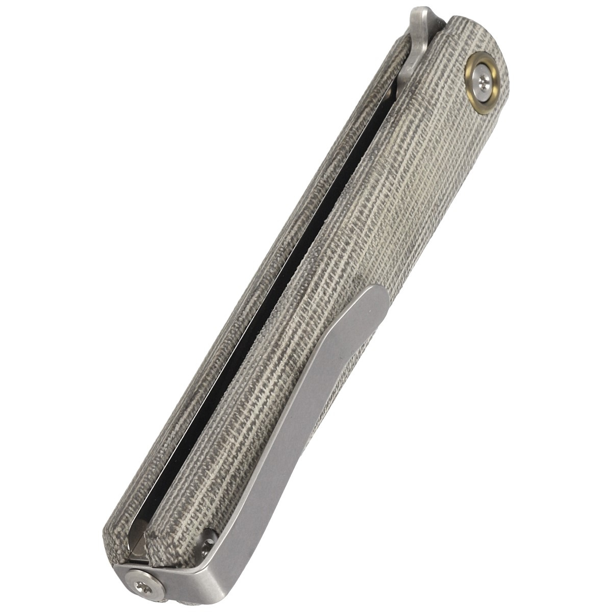 Rękojeść - Canvas Micarty, materiału łączącego niską masę z wysoką odpornością na zużycie i warunki atmosferyczne. Lekko teksturowana powierzchnia zwiększa przyczepność, nawet w wilgotnym środowisku. Konstrukcja oparta na stalowych linersach skręconych przy pomocy dystansowej tulei zapewnia sztywność przy zachowaniu minimalnej wagi. Obustronny, głęboko osadzony deep carry clip umożliwia dyskretne przenoszenie foldera w kieszeni, zarówno przez użytkowników prawo-, jak i leworęcznych. Subtelny detal w postaci anodyzowanego pierścienia wokół pivota dodaje projektowi charakterystycznego akcentu. Folder dostarczany jest w miękkim etui z Cordury z zamkiem i opcją troczenia do paska – idealnym do bezpiecznego przenoszenia lub przechowywania. W zestawie znajdują się również klucze torx T6/T8.