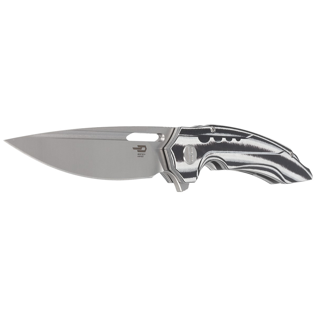 Rękojeść - mocno zakrzywiona, dwukolorowa rękojeść z wielowarstwowego czarnego włókna węglowego i białego kompozytu G10 (włókna szklanego prasowanego pod ciśnieniem z żywicą syntetyczną) zapewnia doskonały uchwyt w wielu pozycjach. Fazowane krawędzie okładek eliminują ostre krawędzie. Przykręcane do solidnego, stalowego backspacera, w jego górnej części otwór na linkę zabezpieczającą lub ozdobną. Oś pivota zdobi stylizowana litera "B". Tytanowy, jednopozycyjny, prawostronny klips deep carry pozwala przenosić dyskretnie nóż w kieszeni w pozycji tip-up (czubkiem ostrza do góry). Podcięcie na palec (fore finger groove) poprawia pewność uchwytu.