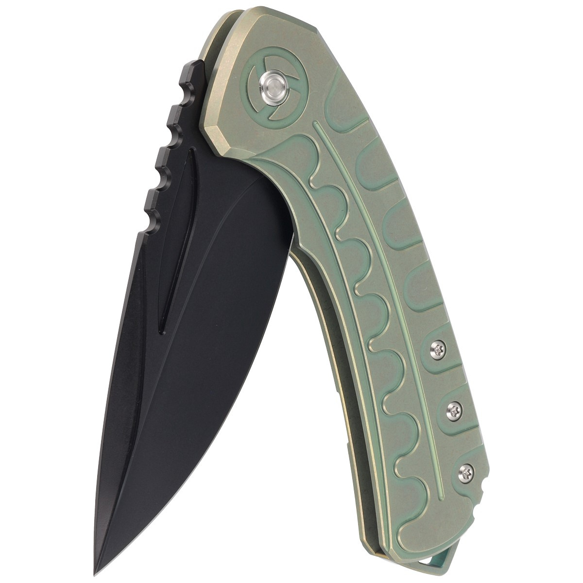 Rękojeść - to dwa kawałki litego tytanu 6AL4V w kolorze Retro Green. Fazowane krawędzie okładek eliminują ostre ranty dla wygody i poprawiają pewność uchwytu, dodatkowe zdobienie w kształcie łusek krokodyla. Masywny backspacer do którego przymocowano okładziny gwarantuje sztywność i wytrzymałość całej konstrukcji. Jednopozycyjny, prawostronny tytanowy klips umożliwia przenoszenie noża w pozycji tip-up, czubkiem ostrza ku górze. Wystająca część backspacera tworzy otwór do przewleczenia linki asekuracyjnej lub ozdobnej, może również służyć jako zbijak do szyb.