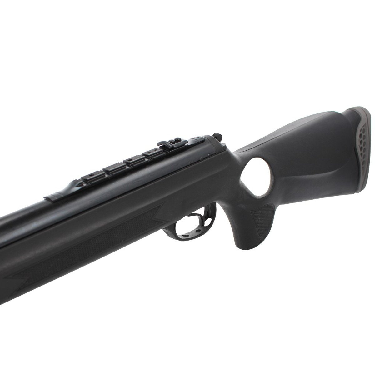 - Manualno - automatyczny bezpiecznik - umieszczony w tylnej części komory cylindra wiatrówki chroni przed oddaniem niekontrolowanego strzału. Takie umiejscowienie pozwala na intuicyjną obsługę bezpiecznika kciukiem. Przed oddaniem strzału należy wcisnąć bezpiecznik co spowoduje zwolnienie blokady spustu, (każdorazowe naciągnięcie sprężyny wiatrówki powoduje automatyczne jego zadziałanie).
