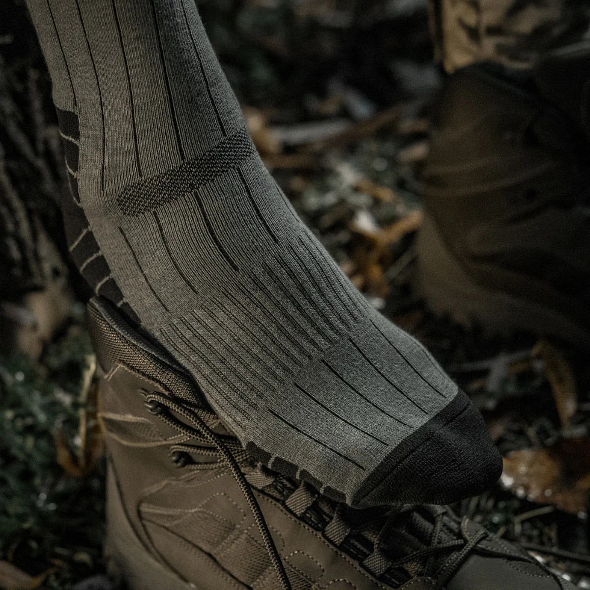 Skarpety taktyczne męskie marki M-Tac cieszą się ogromną popularnością. Wykonane z wysokogatunkowego materiału, zawierającego 78% bawełny, 17% poliamidu i 5% elastanu. Te skarpety są nie tylko przyjemne w dotyku, ale także elastyczne, gwarantując doskonałą termoregulację. Dzięki temu, nosząc je, można uniknąć niekomfortowego efektu pocenia.