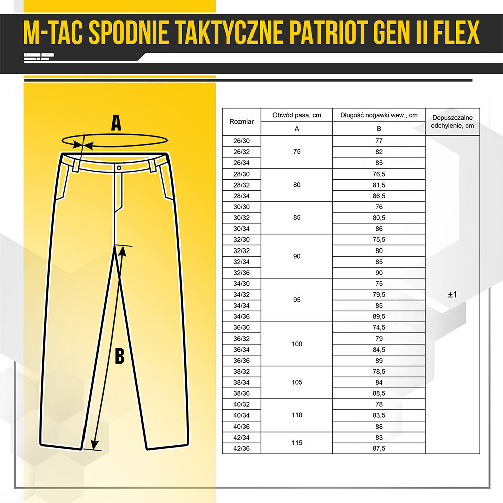 - Patriot Gen.II Flex - lekkie i wytrzymałe spodnie taktyczne z wygodnymi kieszeniami. Idealne do treningów i pracy. Materiał: 63% bawełna, 35% poliester, 2% spandex. zamki YKK.
