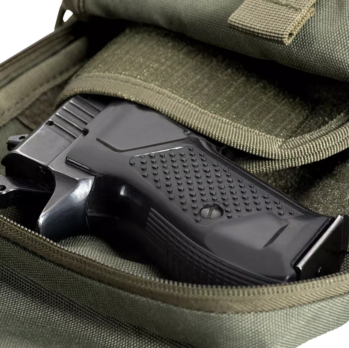 - Torba na ramie z kaburą przystosowana do skrytego przenoszenia broni krótkiej. Wewnątrz komory głównej umieszczono mocowaną na rzep uniwersalną kaburę, pasującą do większości pistoletów w tym Glock 17/19, Colt 1911, CZ-75, Walther P99.