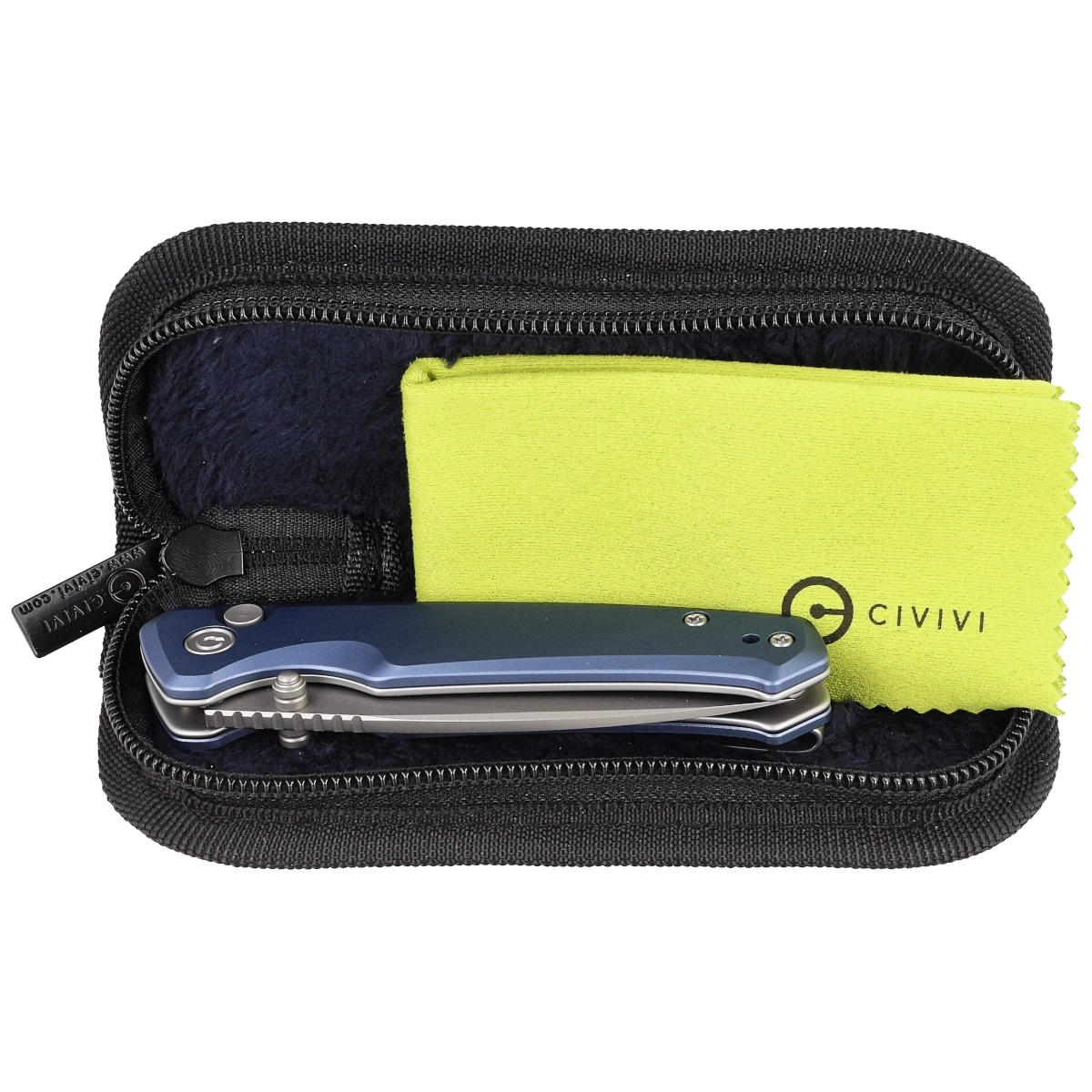 Rękojeść - w kolorze niebieskim. Wykonana z polerowanego aluminium, którego fazowane krawędzie okładek eliminują ostre krawędzie dla wygody, a wykonane z przodu podcięcie na palec (fore finger groove) poprawia pewność uchwytu. Otwarta konstrukcja tzw. open-backed mocowana stalowymi tulejami dystansowymi redukuję wagę oraz ułatwia czyszczenie. Oś pivota zdobi stylizowane logo marki Civivi. Dwupozycyjny, prawo/lewostronny klips deep carry pozwala przenosić dyskretnie nóż w kieszeni w pozycji tip-up (czubkiem ostrza do góry).