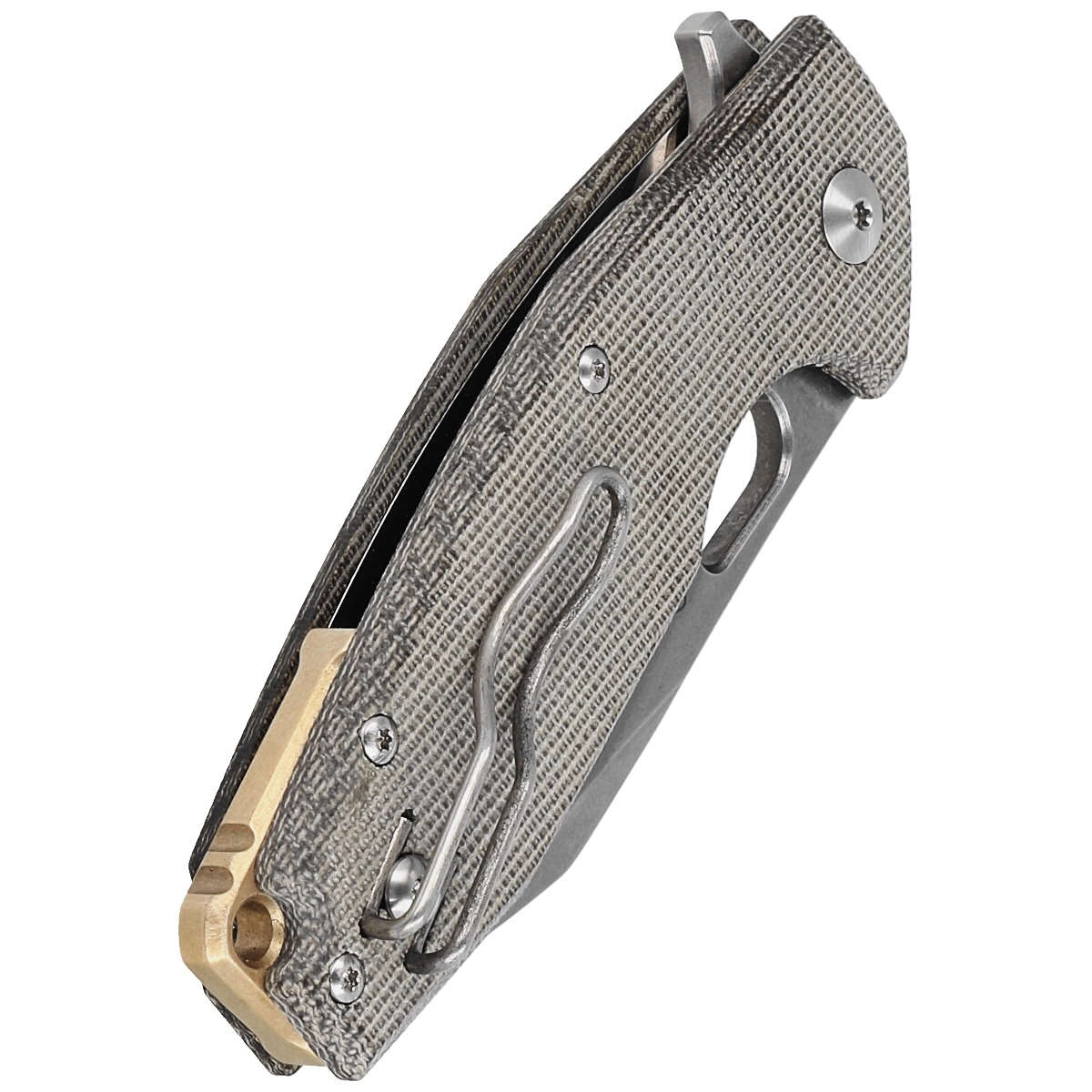 Rękojeść - okładziny z Micarty (płótno prasowane pod ciśnieniem z żywicą syntetyczną) niewrażliwe na warunki atmosferyczne, odporne na uszkodzenia mechaniczne. Fazowane krawędzie okładek eliminują ostre krawędzie dla wygody chwytu. Oksydowany na kolor szary backspacer zapewnia sztywność i solidność całej konstrukcji. Dwupozycyjny (prawa/lewa) lekki klips z drutu (wire clip) umożliwia przenoszenie noża w pozycji tip-up, czubkiem ostrza ku górze. Nad klipsem otwór do przewleczenia linki zabezpieczającej lub ozdobnej.