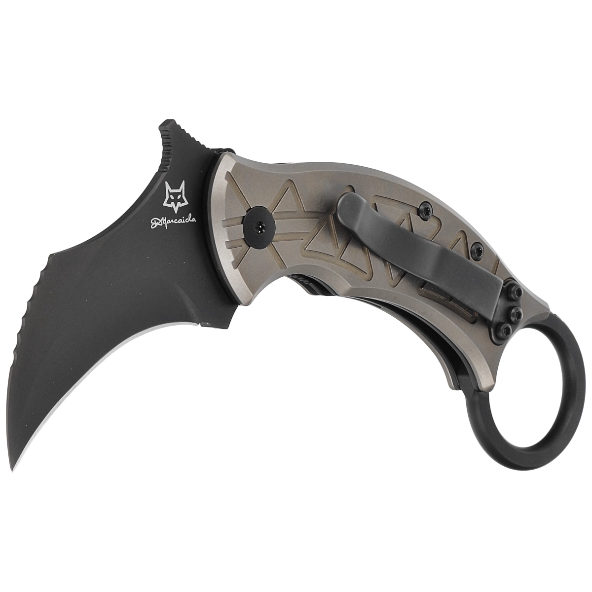 - Tribal K Bronze Titanium Black PVD nowoczesny składany karambit projektu Douga Marcaidy, mistrza filipińskich sztuk walki. Ostrze ze stali M390 pokryte czarną powłoką PVD, rowkowany pierścień na palec, okładziny z tytanu, narzędzie, które nie zawiedzie!