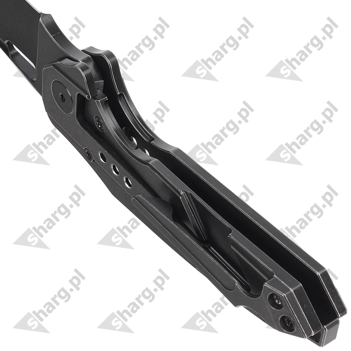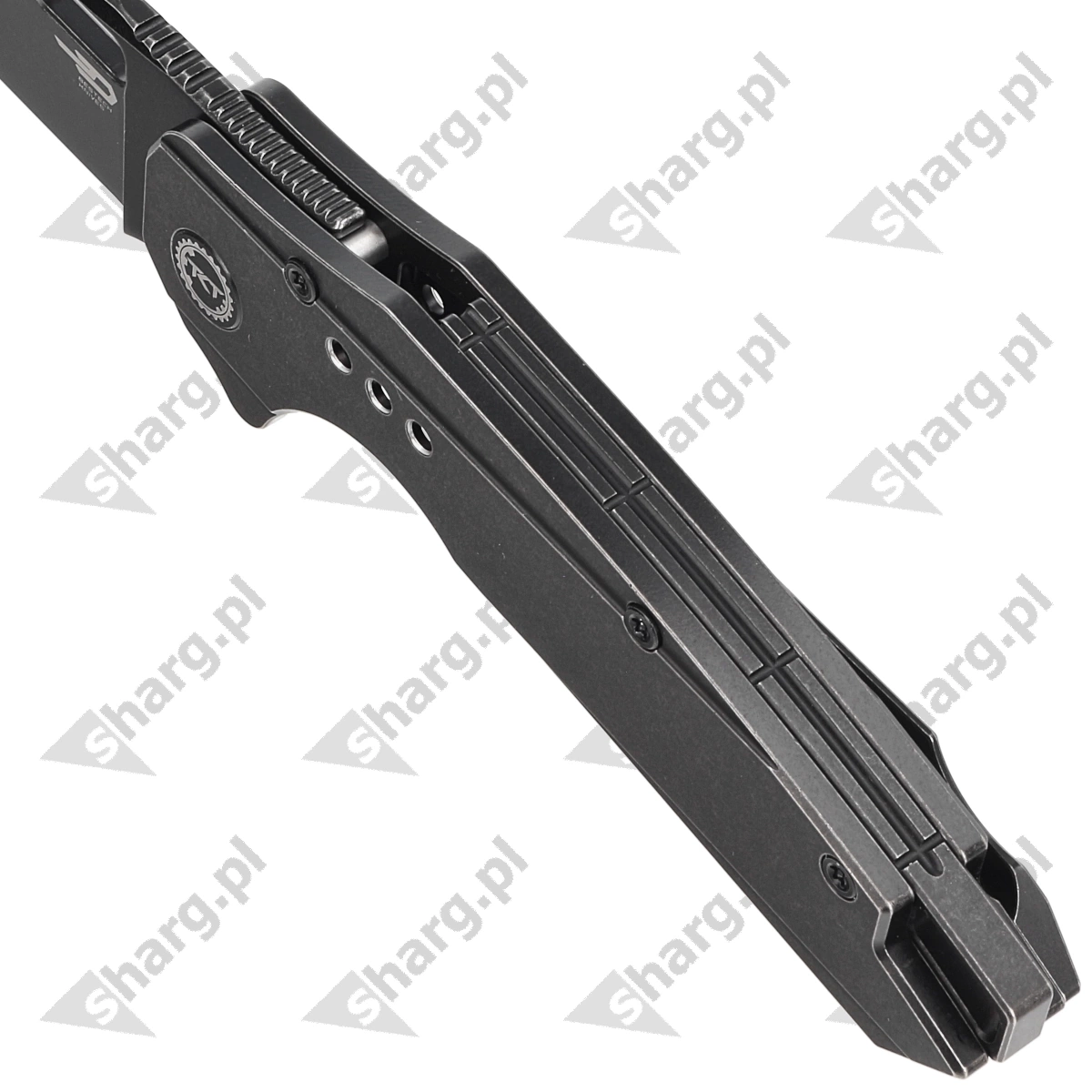 Głownia - szerokatypu Reverse Tanto z maskującym rysy wykończeniem Stonewashedpokrytym nastepnie czarną powłoką. Łagodna krzywizna krawędzi tnącej zbiega się w kierunku ostrego jak igła czubka noża. Grubość klingi zapewnia wysoką wytrzymałość podczas gdy wysoki, płaski szlif daje doskonałą geometrię krawędzi tnącej oraz ekstremalną wydajność cięcia. Dodatkowym wzmocnieniem jest długie zbrocze. Ceramiczne łożyska kulkowe wspomagają otwarcie ostrza za pomocą szybkiej płetwy front flippera (index-finger front flipper). Nóź możemy również otworzyć przy użyciu otworu w klindze (thumb hole). Całość blokowana jest sprawdzoną i popularną blokadą frame lock ze stalową wkładką zabezpieczającą przed wycieraniem czoła blokady.