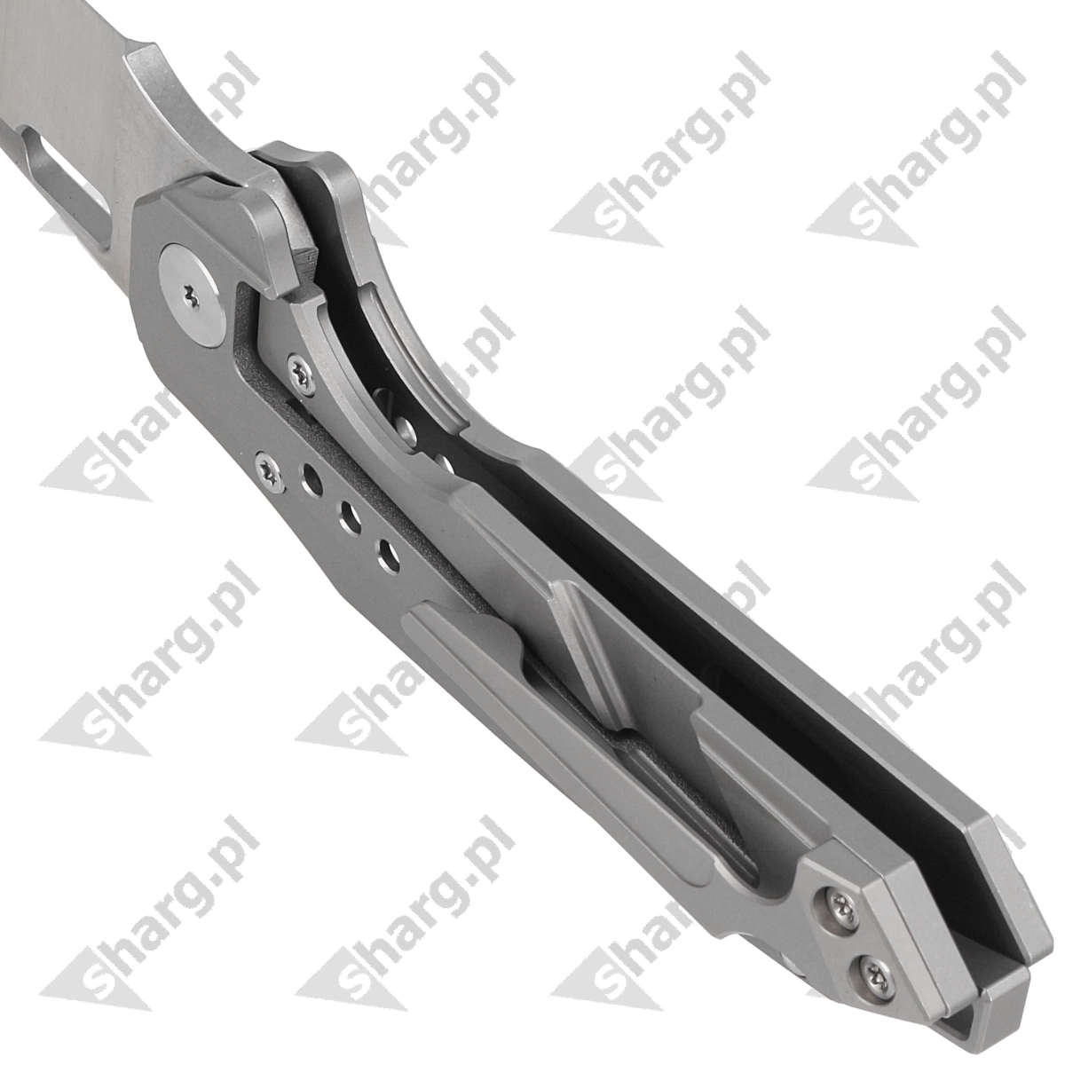 Głownia - szeroka, typu Reverse Tanto z efektownym wykończeniem Two Tone, szlif satynowany, pozostała część wykończona metodą Stonewashed. Łagodna krzywizna krawędzi tnącej zbiega się w kierunku ostrego jak igła czubka noża. Grubość klingi zapewnia wysoką wytrzymałość podczas gdy wysoki, płaski szlif daje doskonałą geometrię krawędzi tnącej oraz ekstremalną wydajność cięcia. Dodatkowym wzmocnieniem jest długie zbrocze. Ceramiczne łożyska kulkowe wspomagają otwarcie ostrza za pomocą szybkiej płetwy front flippera (index-finger front flipper). Nóź możemy również otworzyć przy użyciu otworu w klindze (thumb hole). Całość blokowana jest sprawdzoną i popularną blokadą frame lock ze stalową wkładką zabezpieczającą przed wycieraniem czoła blokady.