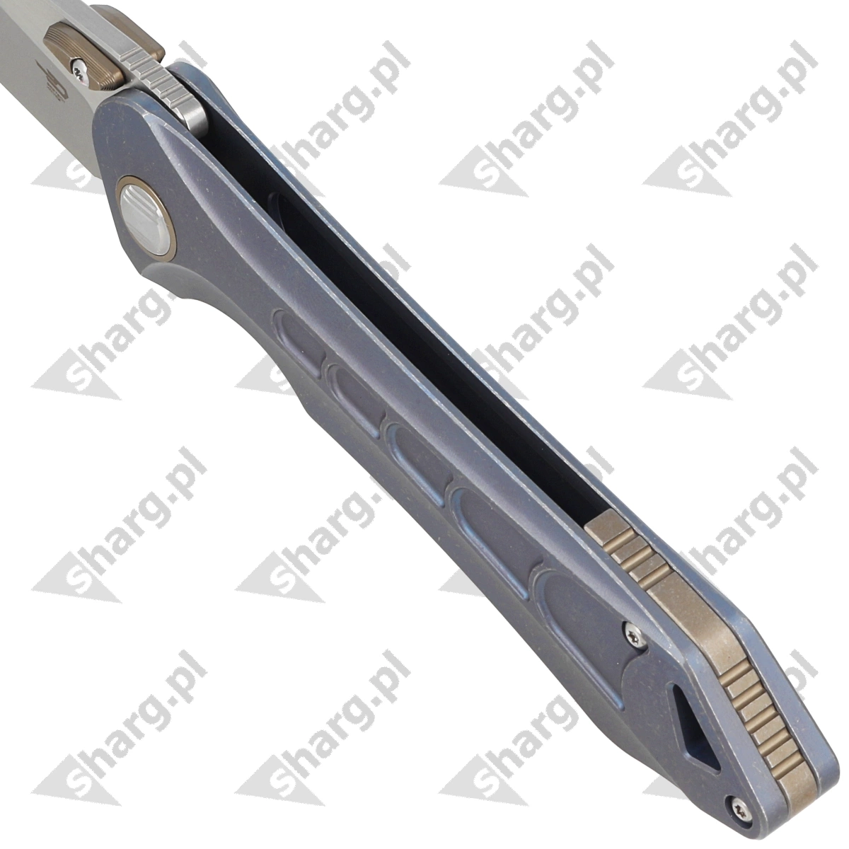 Rękojeść - okładziny z tytanu 6AL4V barwione na niebiesko. Tytanowy backspacer do którego przymocowano okładziny, gwarantuje sztywność i wytrzymałość całej konstrukcji. Jednopozycyjny, prawostronny klips umożliwia przenoszenie noża w pozycji tip-up, czubkiem ostrza ku górze. Nad klipsem otwór do przewleczenia linki zabezpieczającej lub ozdobnej. Klips, backspacer i ozdobny pierścień dookoła pivota (collar ring) wykończone w kolorze brązu, pięknie kontrastującego z niebieskimi okładzinami.