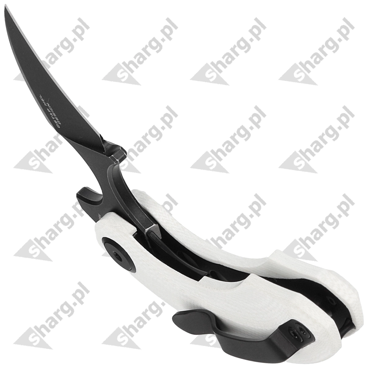 Głownia - typu Hawkbill z maskującym rysy wykończeniem Stonewashed pokrytym czarną powłoką. Wklęsła krawędź tnąca zbiega się w kierunku ostrego jak igła czubka noża. Grubość klingi zapewnia wysoką wytrzymałość podczas gdy wysoki, płaski szlif daje doskonałą geometrię krawędzi tnącej oraz ekstremalną wydajność cięcia. Ceramiczne łożyska kulkowe wspomagają otwarcie ostrza za pomocą szybkiej płetwy flippera (index-finger flipper). Całość blokowana jest sprawdzoną i popularną blokadą liner lock. Po otwarciu, przewężenie tuż za głownią pozwala wygodnie uchwycić nóż zaciśniętą ręką, w pozycji push-dagger. Ostrze wystaje wtedy spomiędzy palców niczym drapieżny szpon!
