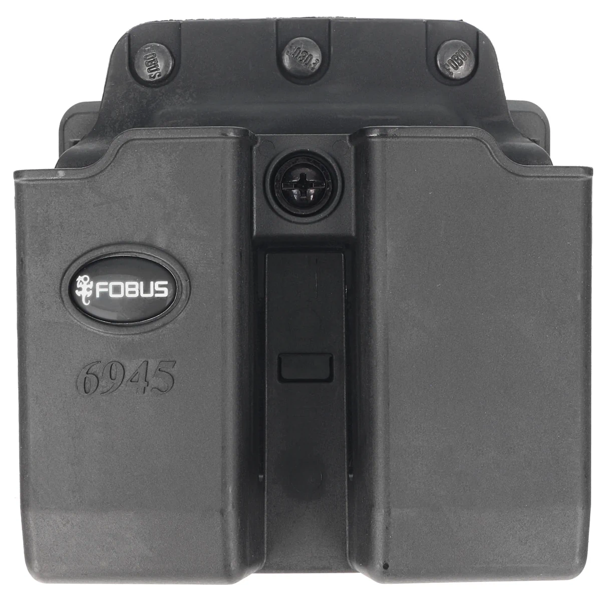 6945 BH ND, ładownica typu otwartego firmy Fobus na dwa dwurzędowe magazynki pistoletowe w kalibrze .45 do pistoletu typu S&W, Springfield, H&K, Walther, FN, nie pasuje do pistoletu Glock. Uchwyt wykonano metodą wtryskową z odpornego na zarysowania, udar oraz ekstremalne temperatury tworzywa sztucznego o dużej gęstości.