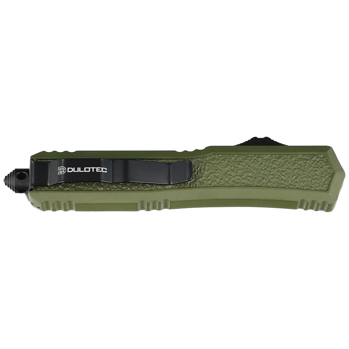 Dulotec OTF OD Green Aluminium, Satin, nóż automatyczny OTF (Out The Front) z głownią wysuwaną z przodu dzięki mocnej sprężynie. Pracuje w trybie D/A (Double Action) czyli za pomocą suwaka wysuwamy i chowamy ostrze. Projekt łączy czyste, nowoczesne linie z taktycznymi korzeniami. Mocna budowa, niezawodność działania oraz rozsądna cena to tylko nieliczne z zalet automatu. Bestseller!