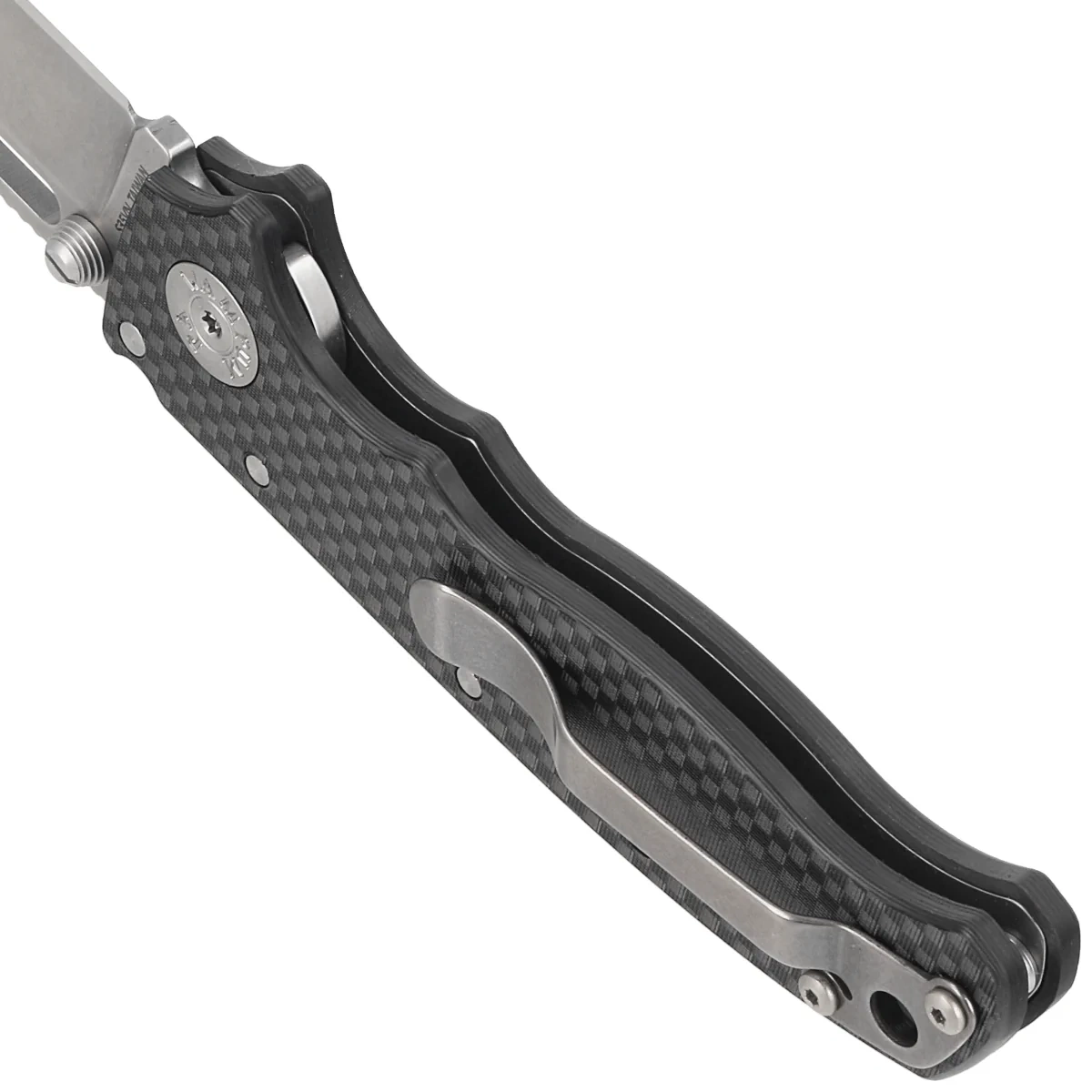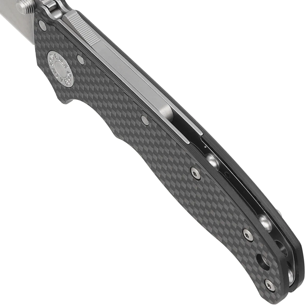 Rękojeść - okładziny z Carbon Fiber, praktycznie niezniszczalnego tworzywa niewrażliwego na warunki atmosferyczne, odpornego na chemikalia i uszkodzenia mechaniczne. Fazowane krawędzie okładek eliminują ostre ranty a charakterystyczne teksturowanie powierzchni poprawia pewność uchwytu. Jednopozycyjny, prawostronny klips umożliwia przenoszenie noża w pozycji tip-up, czubkiem ostrza ku górze. W zestawie dodawany jest klips dla leworęcznych.