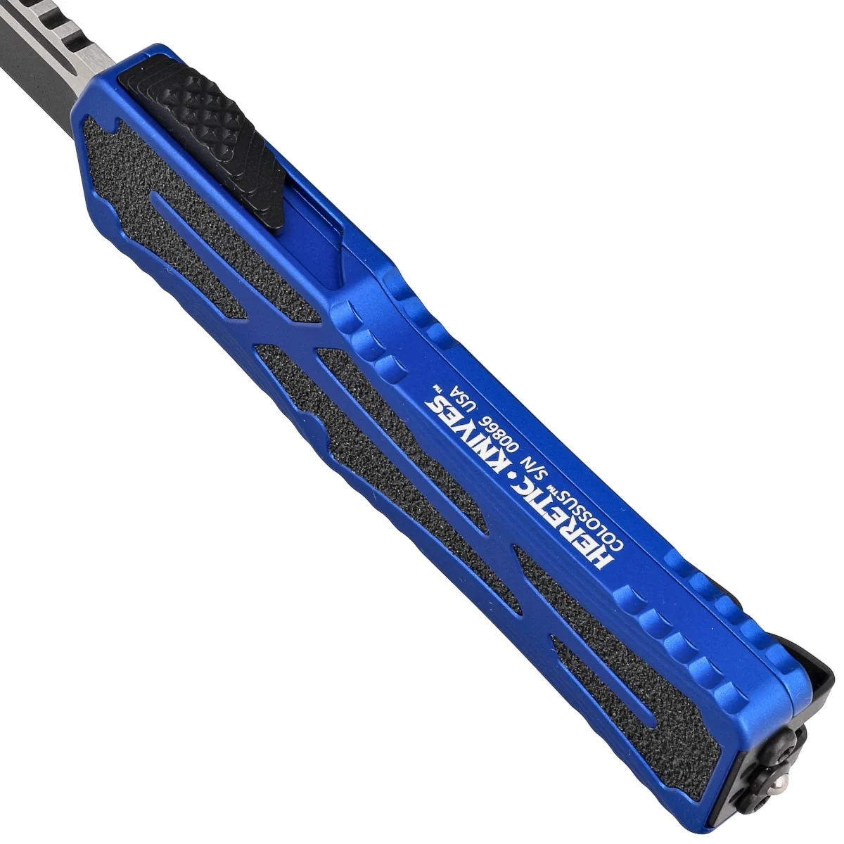 Colossus SE Blue Aluminium, Cerakote Two Tone Black jeden z najlepszych noży automatycznych OTF (Out The Front). Charakteryzuje się doskonałym dopasowaniem i wykończeniem, jakiego można oczekiwać od noża z najwyższej półki. Automat o ponadprzeciętnej wytrzymałości pracuje w trybie D/A (Double Action) wykorzystując działający z ogromną siłą i mocą, oczekujący na opatentowanie mechanizm otwierania noża. W mechanizmie zastosowano łożyska kulkowe zmniejszające tarcie i zapewniające szybkie, płynne blokowanie ostrza. Wstawki zwiększające przyczepność po obu stronach aluminiowej rękojeści zapewniają zarówno styl, jak i funkcjonalność. Projekt Anthony'ego Marfione Jr. właściciela Heretic Knives.