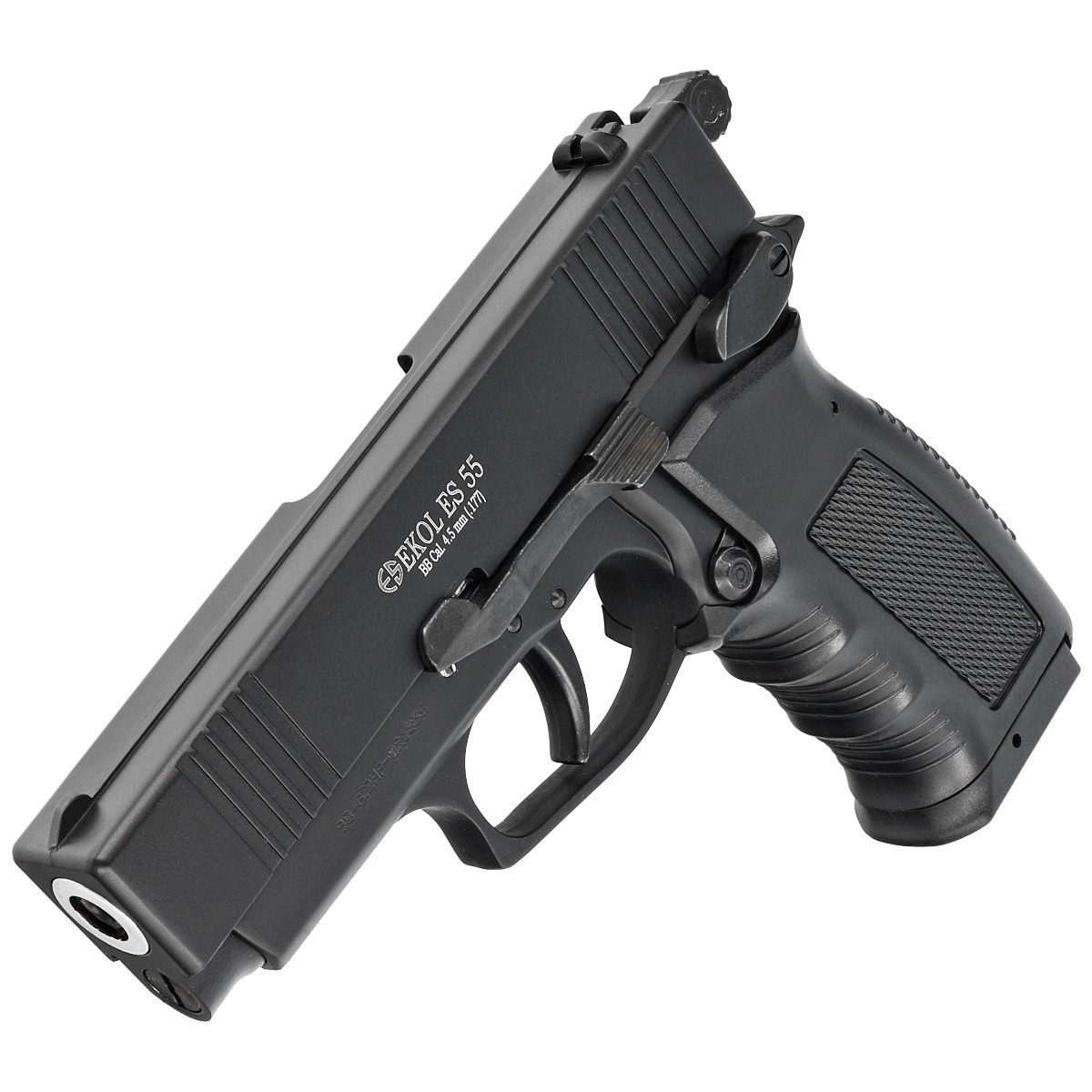 - Ekol ES 55 Czarny Mat - samopowtarzalny pistolet pneumatyczny o konstrukcji opartej na broni sygnałowej. Dzięki tak silnym korzeniom, ten potężny pistolet o prędkości 140 m/s nadaje się do dynamicznego strzelectwa i treningu taktycznego. Metalowy szkielet