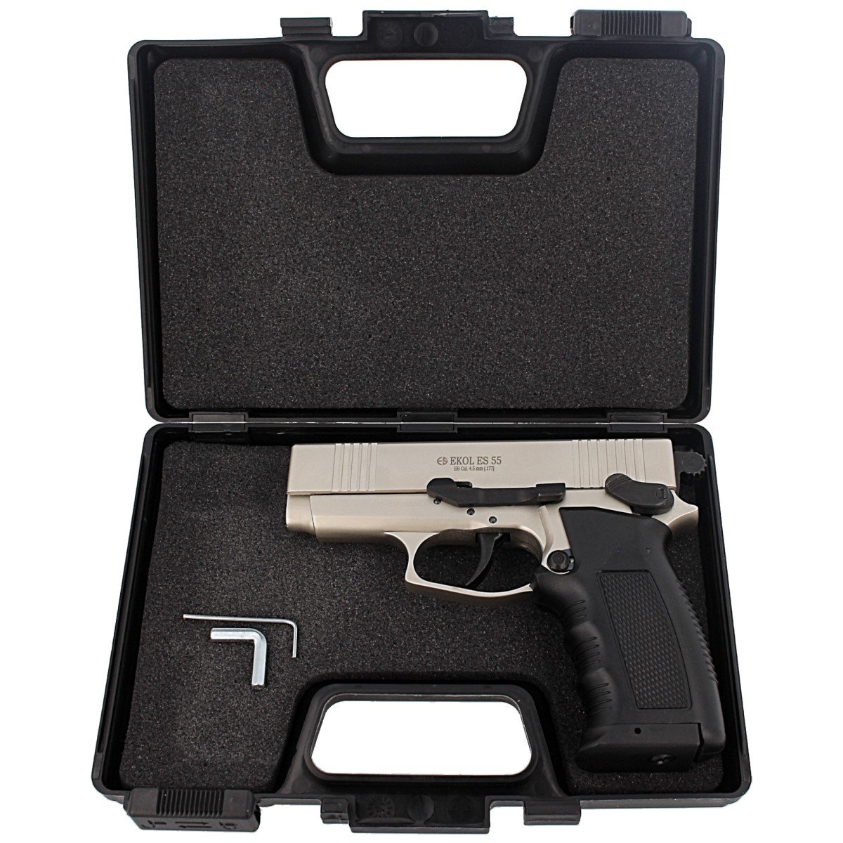 • Ekol ES 55 Satynowy - samopowtarzalny pistolet pneumatyczny o konstrukcji opartej na broni sygnałowej. Dzięki tak silnym korzeniom, ten potężny pistolet o prędkości 140 m/s nadaje się do dynamicznego strzelectwa i treningu taktycznego. Metalowy szkielet.