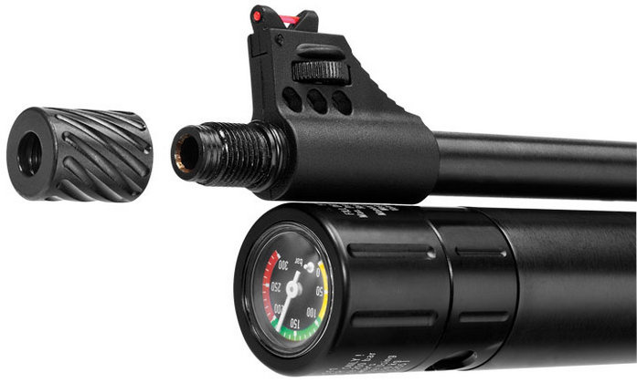 Zasilanie - wymienny zbiornik sprężonego powietrza o pojemności 255 cc. W pełni naładowany kartusz pozwala na oddanie od 25 do 30 efektywnych strzałów w zależności od kalibru wiatrówki (dane dla wersji FAC*). Wbudowany manometr pozwala kontrolować ciśnienie znajdujące się w zbiorniku, a tym samym stopnień jego naładowania. Obrotowy pierścień chroni wlot ładowania przed uszkodzeniem. Po opróżnieniu sprężonego powietrza, pusty kartusz może zostać zastąpiony nowym napełnionym (opcja). Stanowi to doskonałe rozwiązanie dla osób nie zamierzających zabierać pompki PCP czy butli na strzelnicę. 130 bar minimalne ciśnienie robocze w kartuszu rekomendowane przez producenta.