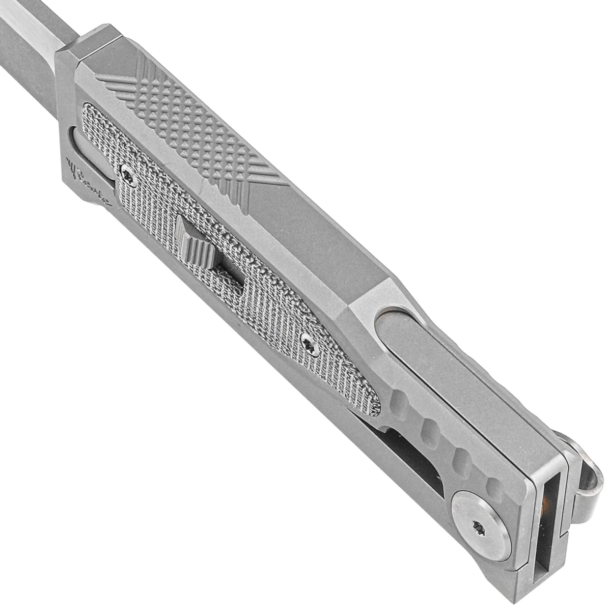 Rękojeść - wykonany na frezarkach CNC tytanowy Exoskeleton, zewnętrzny szkielet z ruchomą górną częścią odpowiadającą za otwieranie i zamykanie noża. Fazowane krawędzie okładek eliminują ostre ranty, a perfekcyjnie dopasowane wkładki z czarnej micarty nadają ekskluzywnego charakteru oraz poprawiają pewność uchwytu. Po prawej stronie kunsztowny suwak blokady przesuwnej do wysuwania/wsuwania klingi. Po przesunięciu go w bezpieczną pozycję "lock", nie otworzymy/zamkniemy noża przez przypadek. Jednopozycyjny tytanowy (prawa) klips deep carry umożliwia dyskretne przenoszenie noża w kieszeni w pozycji tip-down (czubkiem ostrza do dołu).