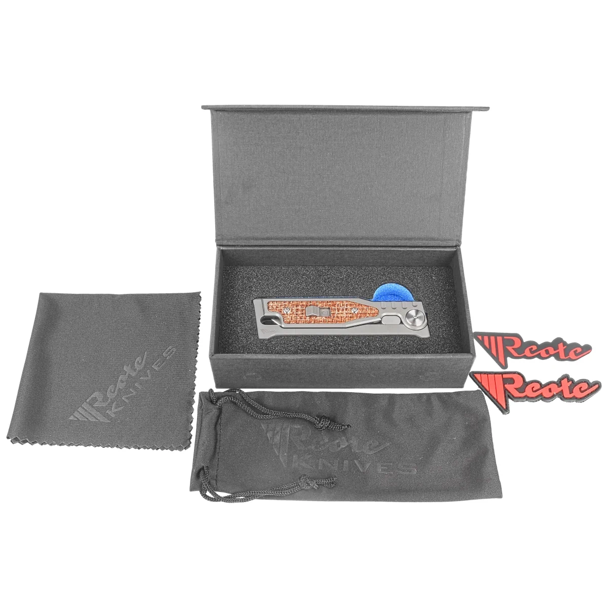 Rękojeść - wykonany na frezarkach CNC tytanowy Exoskeleton, zewnętrzny szkielet z ruchomą górną częścią odpowiadającą za otwieranie i zamykanie noża. Fazowane krawędzie okładek eliminują ostre ranty, a perfekcyjnie dopasowane wkładki z Burlap micarty nadają ekskluzywnego charakteru oraz poprawiają pewność uchwytu. Po prawej stronie kunsztowny suwak blokady przesuwnej do wysuwania/wsuwania klingi. Po przesunięciu go w bezpieczną pozycję "lock", nie otworzymy/zamkniemy noża przez przypadek. Jednopozycyjny tytanowy (prawa) klips deep carry umożliwia dyskretne przenoszenie noża w kieszeni w pozycji tip-down (czubkiem ostrza do dołu).