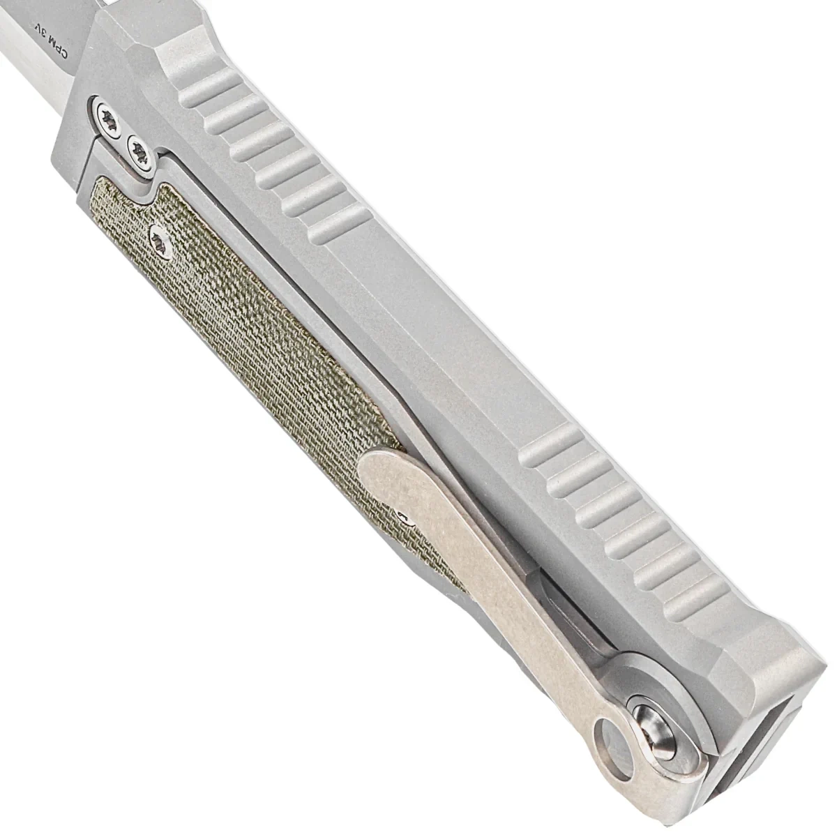 Nazwa produktu: Mini EXO OTF Gravity Tanto Edge Bead Blasted Titanium / Green Micarta, Stonewashed
