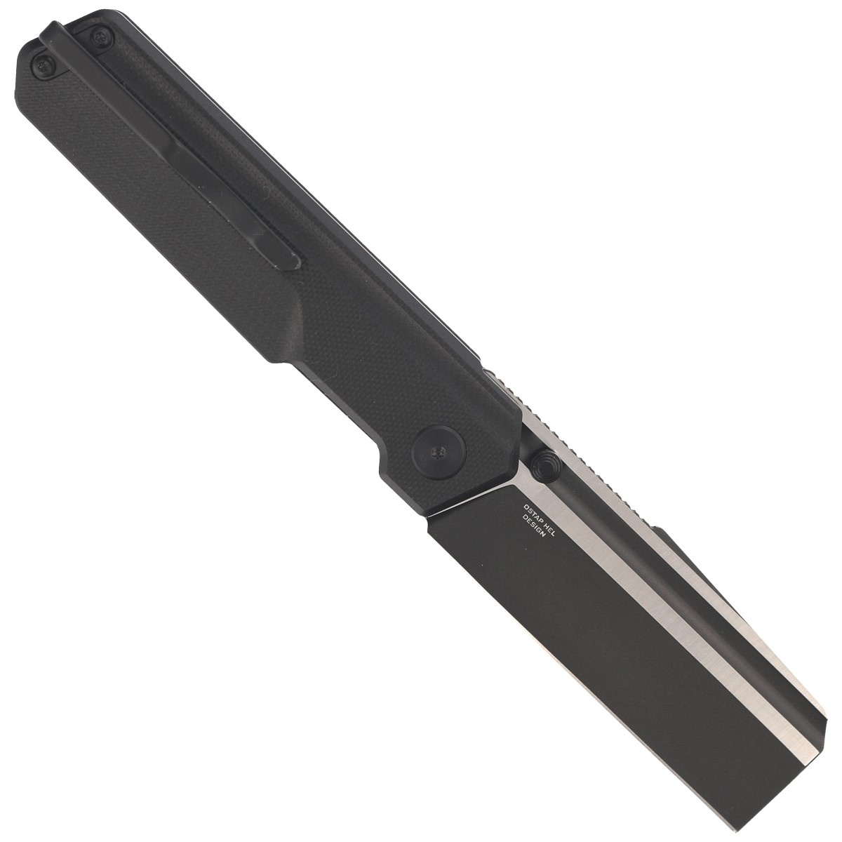 Głownia - typu Cleaver (tasak) z eleganckim wykończeniem Two Tone, szlify pokryte czarną powłoką DLC, pozostała część satynowana. Prosta linia krawędzi tnącej zbiega się w kierunku płaskiego, bezpiecznego zakończenia klingi. Grubość klingi w połączeniu z wysokim, płaskim szlifem daje doskonałą geometrię krawędzi tnącej oraz ekstremalną wydajność cięcia. Ceramiczne łożyska kulkowe wspomagają otwarcie ostrza za pomocą obustronnego kołka w klindze (dual thumb stud). Fragment grzbietu klingi pokryto upper jimping, karbowanym oparciem pod kciuk ułatwiającym kontrolę nad nożem. Całość blokowana jest sprawdzoną i popularną blokadą liner lock.