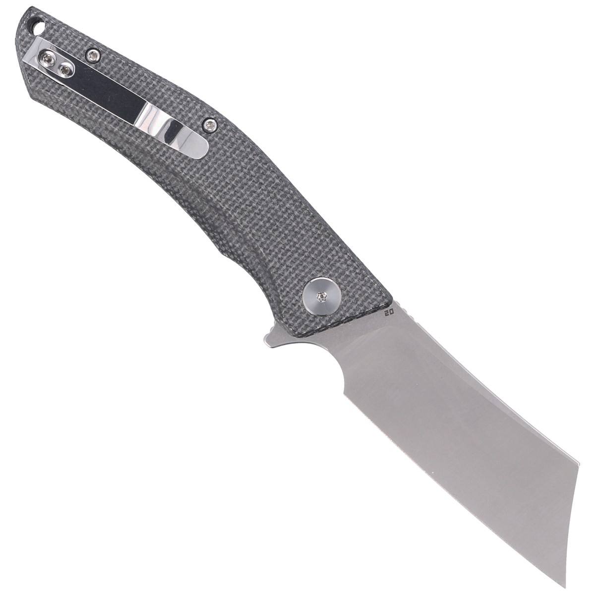 Głownia - typu Cleaver (tasak) wykończona efektownie metodą Two Tone, płazy satynowane, pozostała część wykończona Stonewashem. Lekko zakrzywiona krawędź tnąca zbiega się w kierunku ostrego czubka noża. Grubość klingi zapewnia wysoką wytrzymałość podczas gdy wysoki, płaski szlif daje doskonałą geometrię krawędzi tnącej oraz ekstremalną wydajność cięcia. Ceramiczne łożyska kulkowe wspomagają otwarcie ostrza za pomocą szybkiej płetwy flippera (index-finger flipper) po otwarciu pełniącej funkcję jelca. Fragment grzbietu klingi pokryto upper jimping, karbowanym oparciem pod kciuk ułatwiającym kontrolę nad nożem. Całość blokowana jest sprawdzoną i popularną blokadą liner lock.