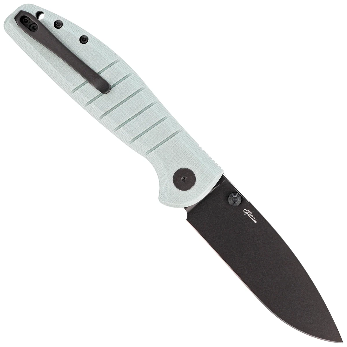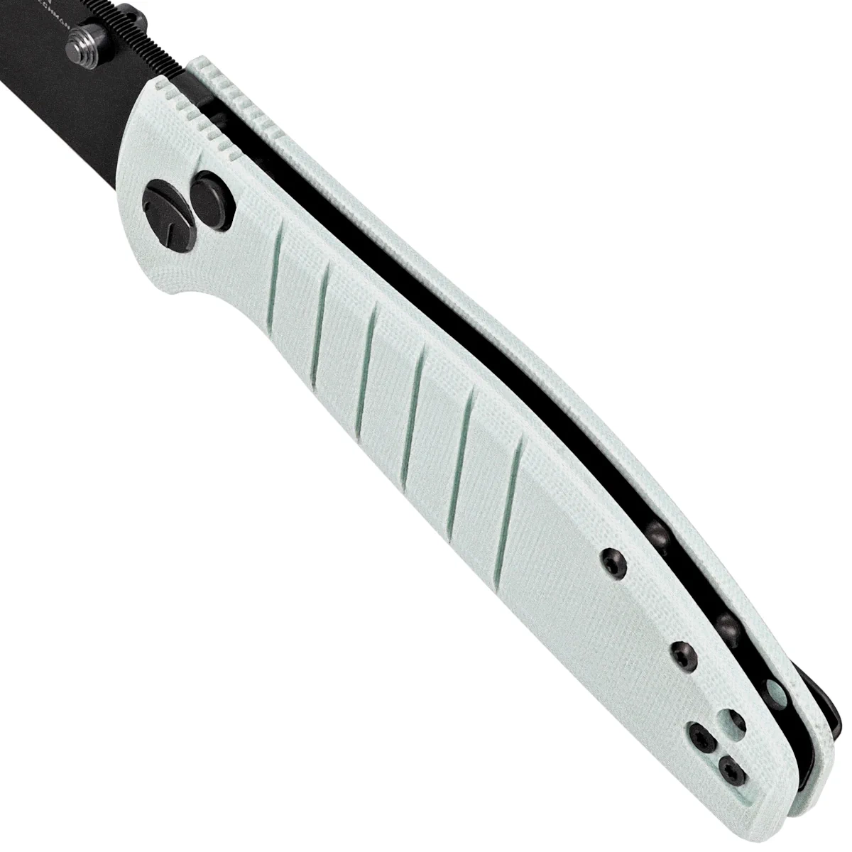 Rękojeść - wykonana z G10, kompozytowego materiału z włókna szklanego prasowanego pod ciśnieniem z syntetyczną żywicą. Agresywna tekstura okładzina zapewnia pewny chwyt, nawet mokrymi dłońmi. Fazowane krawędzie okładek eliminują ostre krawędzie dla wygody, a wykonany z przodu podcięcie na palec poprawia ergonomię. Otwarta konstrukcja tzw. open-backed mocowana stalowymi tulejami dystansowymi redukuję wagę oraz ułatwia czyszczenie. Dwupozycyjny, prawo/lewostronny klips deep carry pozwala przenosić dyskretnie nóż w kieszeni w pozycji tip-up (czubkiem ostrza ku górze).