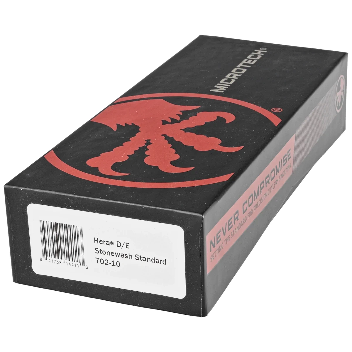 - Hera Double Edge Black Aluminium, Stonewashed jeden z najlepszych noży automatycznych OTF. Wygodny do przenoszenia, przy zachowaniu mocy większych modeli. Projekt Anthony'ego Marfione knifemakera i właściciela Microtech Knives.