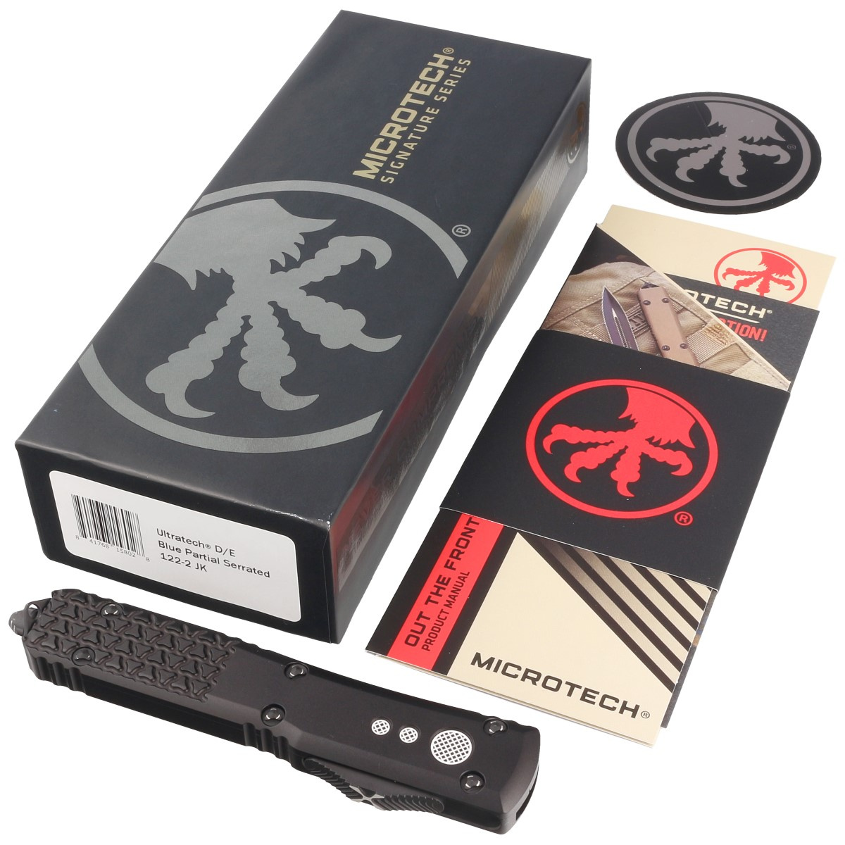 - Ultratech D/E Jedi Knight Signature Black Aluminium, Blue P/S to pełnowymiarowy nóż automatyczny OTF z serii Ultratech Signature. Pracujący w trybie D/A, wyposażony w piekielnie szybki mechanizm wysuwający ostrze. Projekt Tony Marfione Microtech Knives