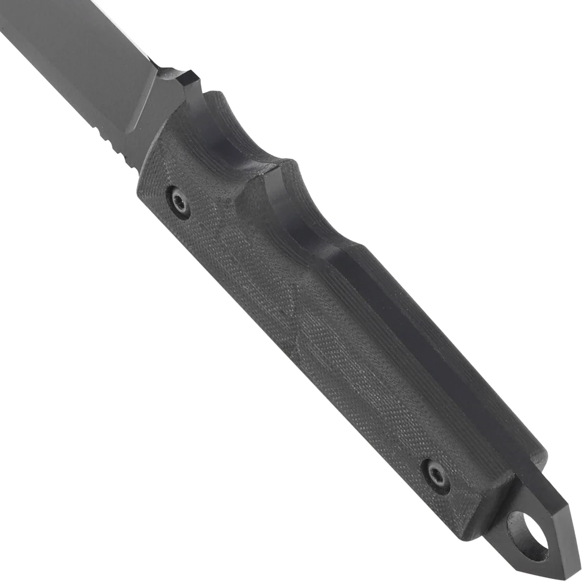 Rękojeść - pokryta wytrzymałymi okładzinami z G10 (włókno szklane prasowana pod ciśnieniem z żywicą syntetyczną) w kolorze czarnym, o lekko chropowatej powierzchni. Zapewniają doskonałą ergonomię oraz pewny uchwyt. Profilowana konstrukcja rękojeści zapewnia wygodny chwyt noża w obie strony, specjalnie dla użytkowników, ceniących odwrócony chwyt. W tylnej wystający fragment tanga tworzy masywny zbijak do szyb, znajduje się w nim również lanyard hole, otwór na linkę.