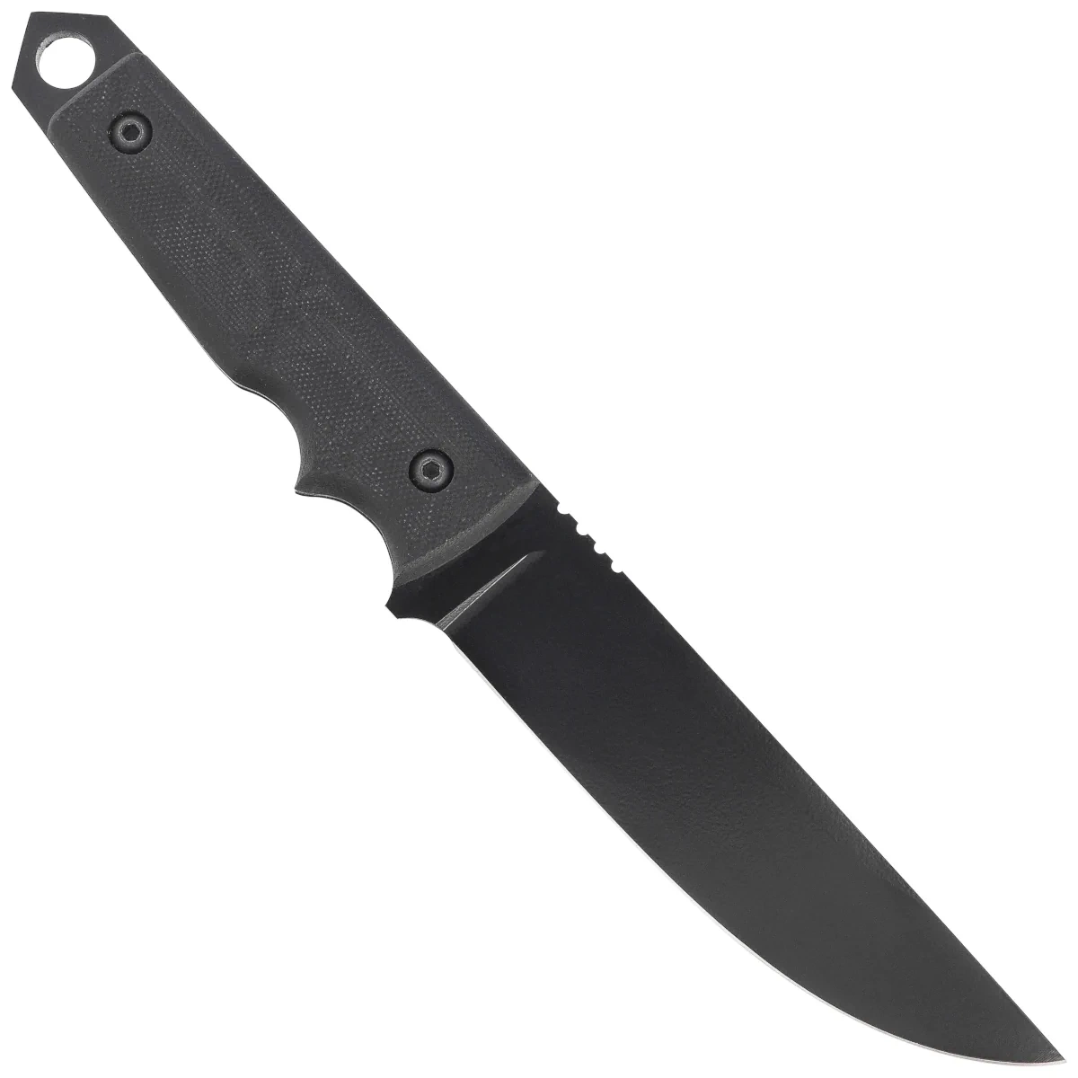 Głownia - niezwykle ostra o profilu Straight Back, z zaznaczonym brzuchem, idealna do wszelkich prac. Pokryta czarną powłoką Cerakote™, ostrze Plain wyprowadzono wysokim szlifem płaskim (Flat Grind), wysoki szlif daje doskonałą geometrię krawędzi tnącej oraz ekstremalną wydajność cięcia. Powiększony jelec chroni dłoń przed zsunięciem się na ostrze. Na grzbiecie klingi upper jimping, karbowane oparcie pod kciuk.