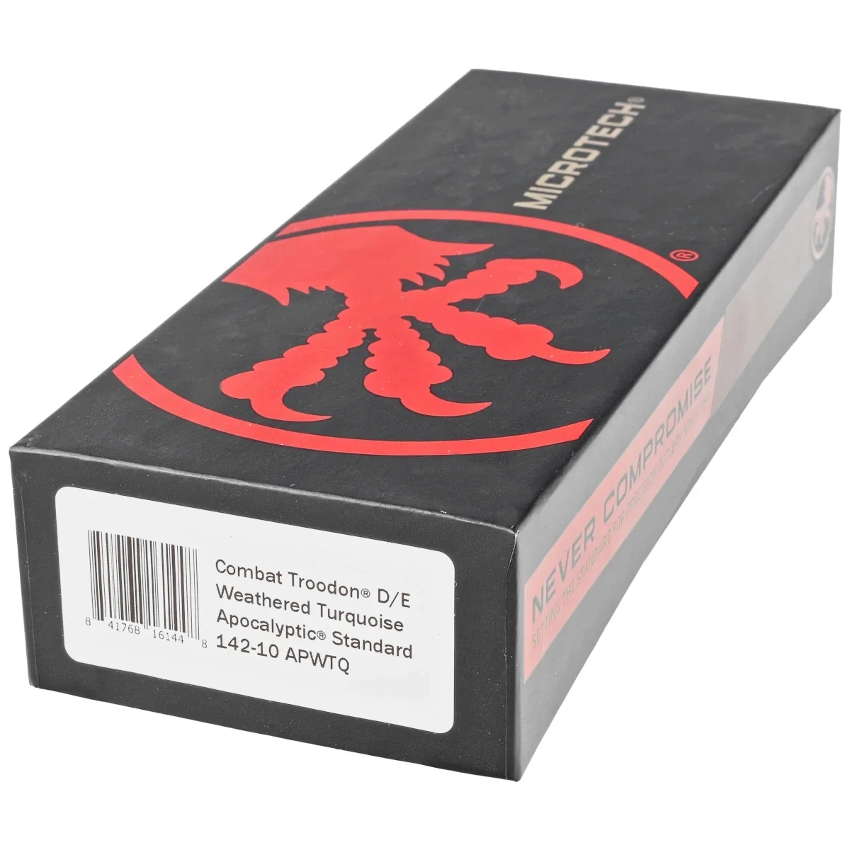 Combat Troodon D/E Weathered Turquoise Aluminium, Apocalyptic to największy nóż automatyczny OTF (Out The Front) z serii Troodon, zbudowany z myślą o szerokim spektrum zastosowań użytkowych. Precyzyjnie wykonany, wyposażony w wyrafinowany i piekielnie szybki mechanizm wysuwający ostre jak brzytwa ostrze. W 100% wyprodukowany i zmontowany w USA. Projekt Anthony'ego Marfione, knifemakera i właściciela Microtech Knives.